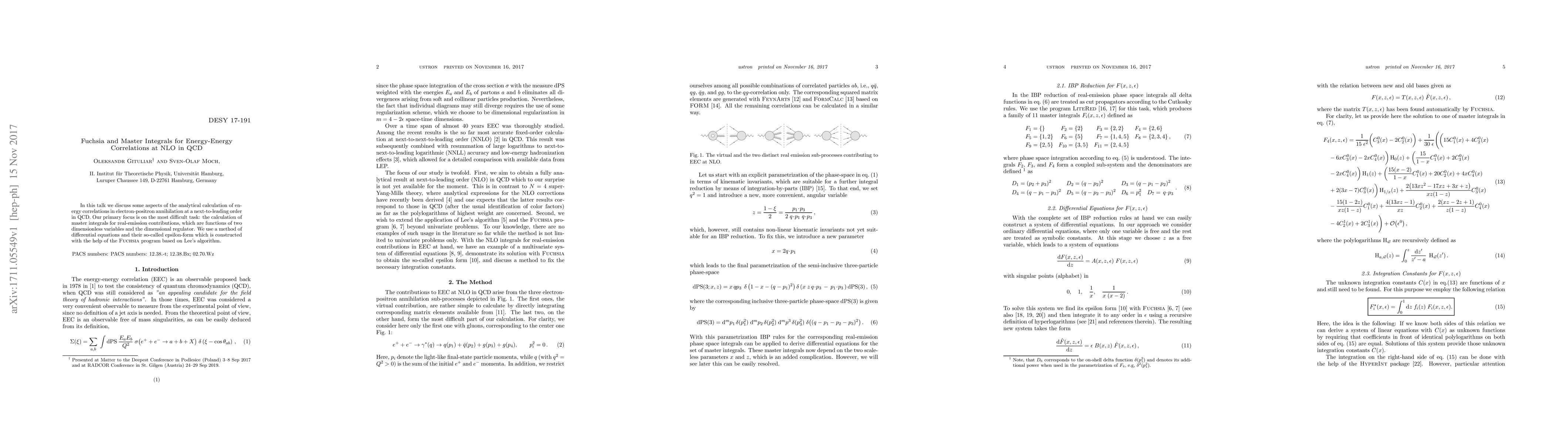 This paper presents an analytical calculation of energy correlations in electron-positron annihilation at next-to-leading order in QCD, focusing on the challenging computation of master integrals for real-emission contributions. The Fuchsia program, based on Lee's algorithm, is employed to solve the differential equations in the epsilon-form.
