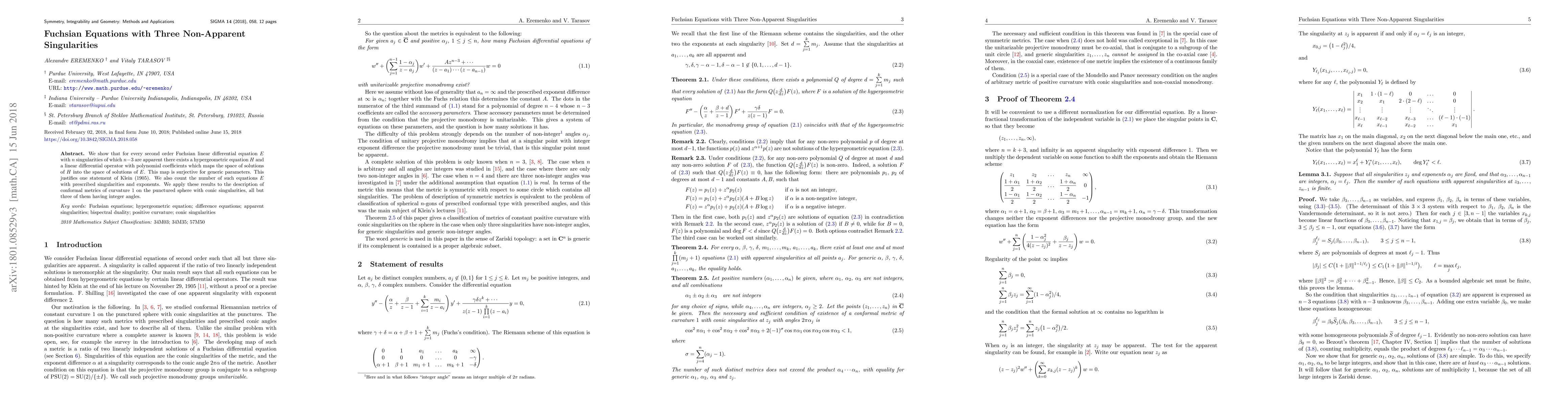 This paper demonstrates a mapping between a hypergeometric equation and a second-order Fuchsian equation with three non-apparent singularities, proving surjectivity for generic parameters and justifying a Klein statement from 1905. It also counts the number of such Fuchsian equations and applies the results to conformal metrics of curvature 1 on the punctured sphere.