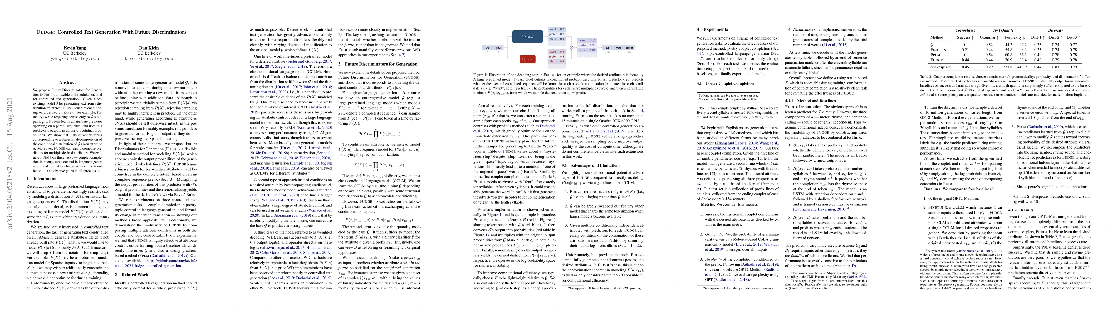 FUDGE is a method for controlled text generation that enables conditioning on desired attributes without requiring access to model weights, improving performance in tasks like poetry completion and machine translation.