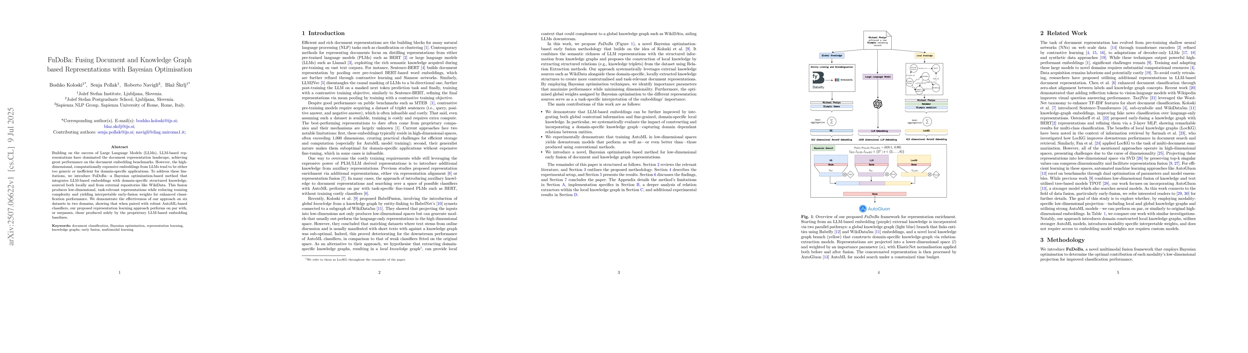 Building on the success of Large Language Models (LLMs), LLM-based representations have dominated the document representation landscape, achieving great performance on the document embedding benchmarks. However, the high-dimensional, computationally expensive embeddings from LLMs tend to be either too generic or inefficient for domain-specific applications. To address these limitations, we introduce FuDoBa a Bayesian optimisation-based method that integrates LLM-based embeddings with domain-specific structured knowledge, sourced both locally and from external repositories like WikiData. This fusion produces low-dimensional, task-relevant representations while reducing training complexity and yielding interpretable early-fusion weights for enhanced classification performance. We demonstrate the effectiveness of our approach on six datasets in two domains, showing that when paired with robust AutoML-based classifiers, our proposed representation learning approach performs on par with, or surpasses, those produced solely by the proprietary LLM-based embedding baselines.