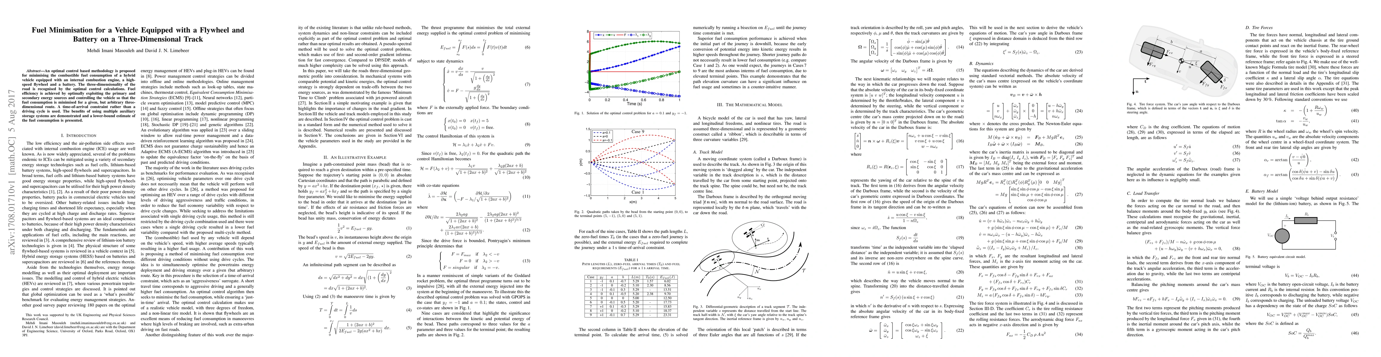 An optimal control based methodology is proposed for minimising the combustible fuel consumption of a hybrid vehicle equipped with an internal combustion engine, a high-speed flywheel and a battery. The three-dimensionality of the road is recognised by the optimal control calculations. Fuel efficiency is achieved by optimally exploiting the primary and secondary energy sources and controlling the vehicle so that the fuel consumption is minimised for a given, but arbitrary three-dimensional route. A time-of-arrival constraint rather than a driving cycle is used. The benefits of using multiple auxiliary storage systems are demonstrated and a lower-bound estimate of the fuel consumption is presented.
