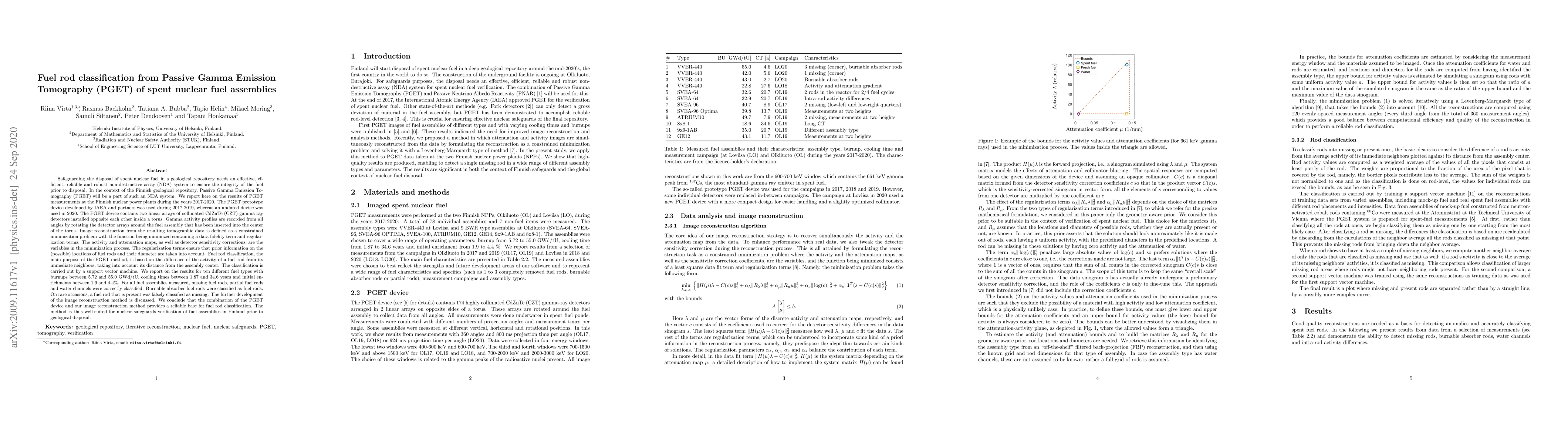The research utilized Passive Gamma Emission Tomography (PGET) to analyze spent nuclear fuel assemblies, reconstructing activity and attenuation maps through a constrained minimization problem with regularization terms. Fuel rod classification was achieved using a support vector machine based on the activity difference of a rod from its neighbors, considering its distance from the assembly center.