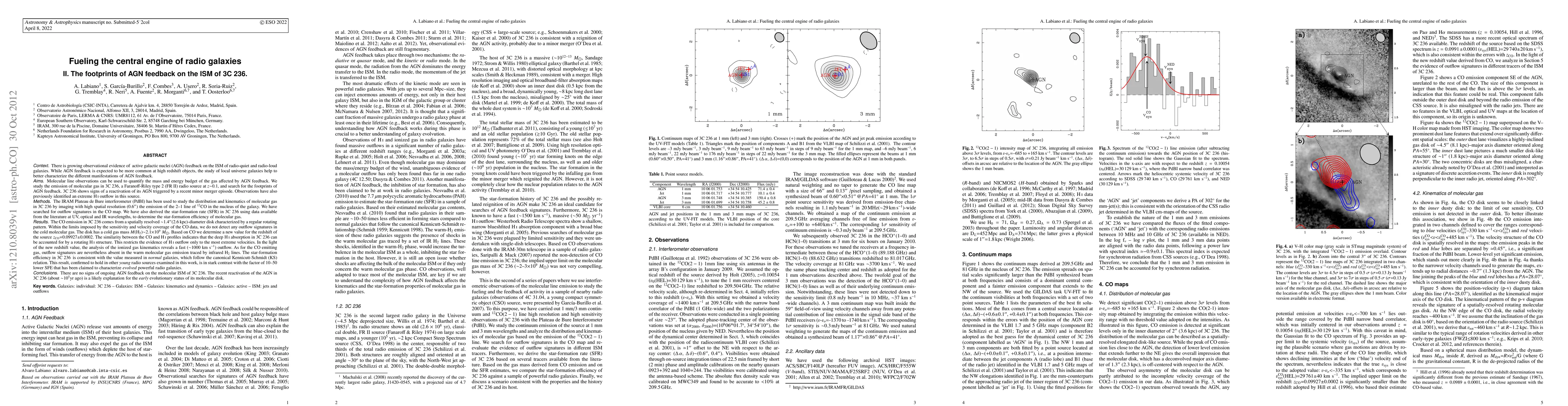 Aims: We study the emission of molecular gas in 3C236, a FR II radio source at z~0.1, and search for the footprints of AGN feedback. 3C236 shows signs of a reactivation of its AGN triggered by a recent minor merger episode. Observations have also previously identified an extreme HI outflow in this source. Methods: The IRAM PdBI has been used to study the distribution and kinematics of molecular gas in 3C236 by imaging with high spatial resolution the emission of the 12CO(2-1) line in the nucleus of the galaxy. We have searched for outflow signatures in the CO map. We have also derived the SFR in 3C236 using data available from the literature at UV, optical and IR wavelengths, to determine the star-formation efficiency of molecular gas. Results: The CO emission in 3C236 comes from a spatially resolved 2.6 kpc disk with a regular rotating pattern. Within the limits imposed by the sensitivity and velocity coverage of the CO data, we do not detect any outflow signatures in the cold molecular gas. The disk has a cold gas mass M(H2)~2.1x10^9 Msun. We determine a new value for the redshift of the source zCO=0.09927. The similarity between the CO and HI profiles indicates that the deep HI absorption in 3C236 can be accounted for by a rotating HI structure, restricting the evidence of HI outflow to the most extreme velocities. In the light of the new redshift, the analysis of the ionized gas kinematics reveals a 1000 km/s outflow. As for the CO emitting gas, outflow signatures are nevertheless absent in the warm molecular gas emission traced by infrared H2 lines. The star-formation efficiency in 3C236 is consistent with the value measured in normal galaxies, which follow the canonical KS-law. This result, confirmed to hold in other young radio sources examined in this work, is in stark contrast with the factor of 10-50 lower SFE that seems to characterize evolved powerful radio galaxies.