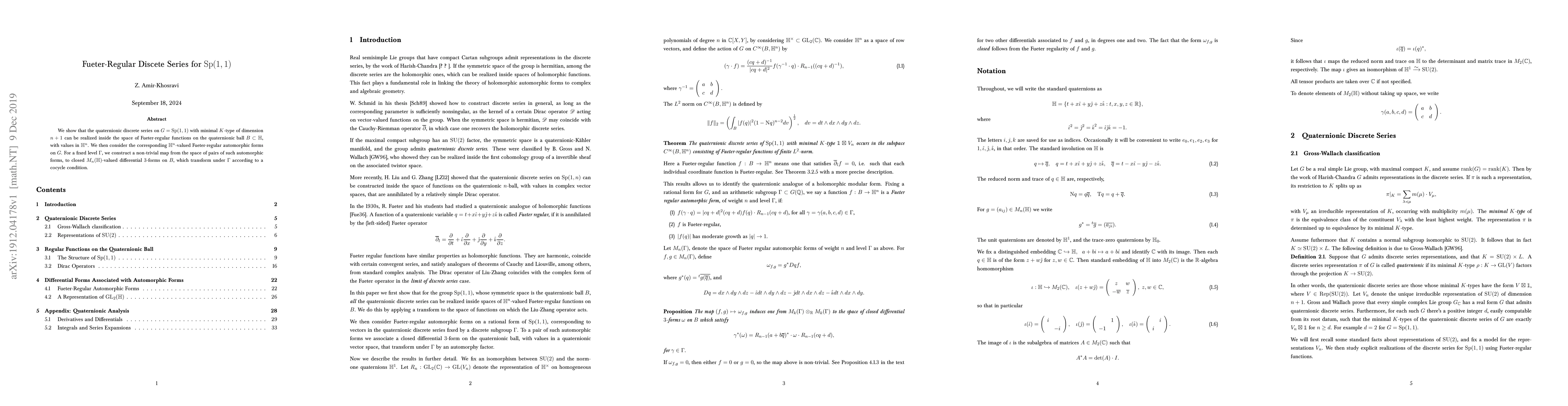 We show that the quaternionic discrete series on G=Sp(1,1) with minimal K-type of dimension n+1 can be realized inside the space of Fueter-regular functions on the quaternionic ball B in H, with values in H^n. We then consider the corresponding $H^n$-valued Fueter-regular automorphic forms on G. For a fixed level $\Gamma$, we construct a non-trivial map from the space of pairs of such automorphic forms, to closed $M_n(H)$-valued differential $3$-forms on $B$, which transform under $\Gamma$ according to a cocycle condition.