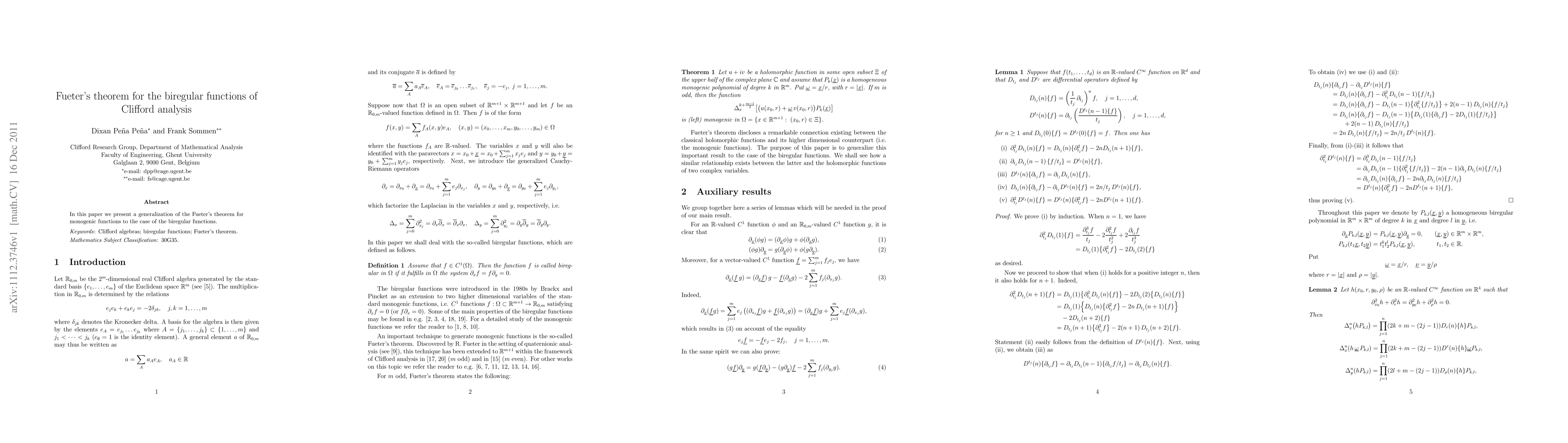 Summary: This paper generalizes Fueter's theorem from monogenic functions to biregular functions within the framework of Clifford analysis, extending the theorem's applicability to a broader class of functions.