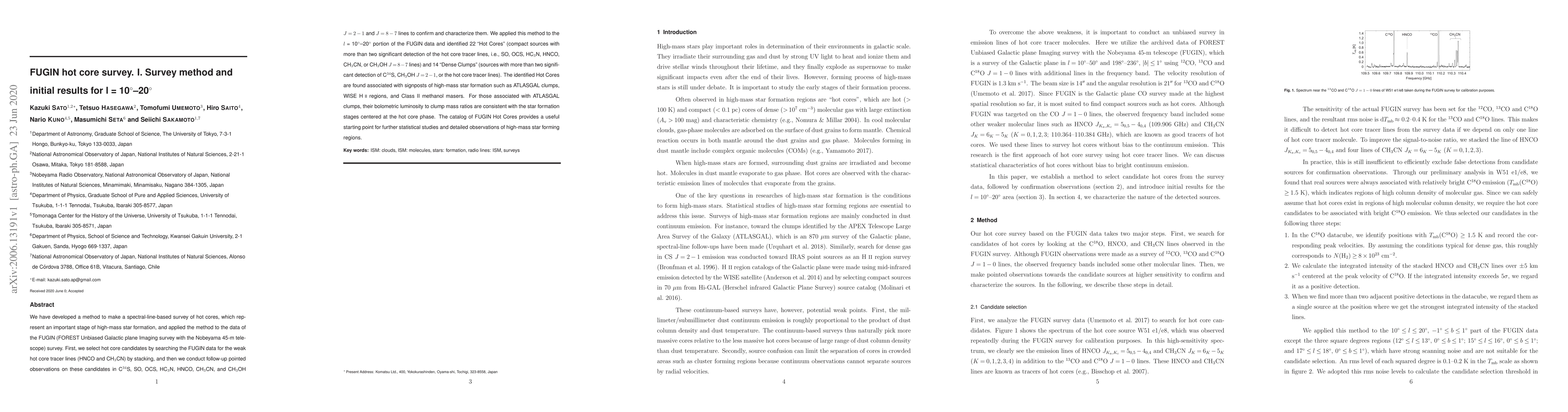 We have developed a method to make a spectral-line-based survey of hot cores, which represent an important stage of high-mass star formation, and applied the method to the data of the FUGIN (FOREST Unbiased Galactic plane Imaging survey with the Nobeyama 45-m telescope) survey. First, we select hot core candidates by searching the FUGIN data for the weak hot core tracer lines (HNCO and CH$_3$CN) by stacking, and then we conduct follow-up pointed observations on these candidates in C$^{34}$S, SO, OCS, HC$_3$N, HNCO, CH$_3$CN, and CH$_3$OH $J=2-1$ and $J=8-7$ lines to confirm and characterize them. We applied this method to the $l = 10^\circ-20^\circ$ portion of the FUGIN data and identified 22 "Hot Cores" (compact sources with more than two significant detection of the hot core tracer lines, i.e., SO, OCS, HC$_3$N, HNCO, CH$_3$CN, or CH$_3$OH $J=8-7$ lines) and 14 "Dense Clumps" (sources with more than two significant detection of C$^{34}$S, CH$_3$OH $J=2-1$, or the hot core tracer lines). The identified Hot Cores are found associated with signposts of high-mass star formation such as ATLASGAL clumps, WISE HII regions, and Class II methanol masers. For those associated with ATLASGAL clumps, their bolometric luminosity to clump mass ratios are consistent with the star formation stages centered at the hot core phase. The catalog of FUGIN Hot Cores provides a useful starting point for further statistical studies and detailed observations of high-mass star forming regions.