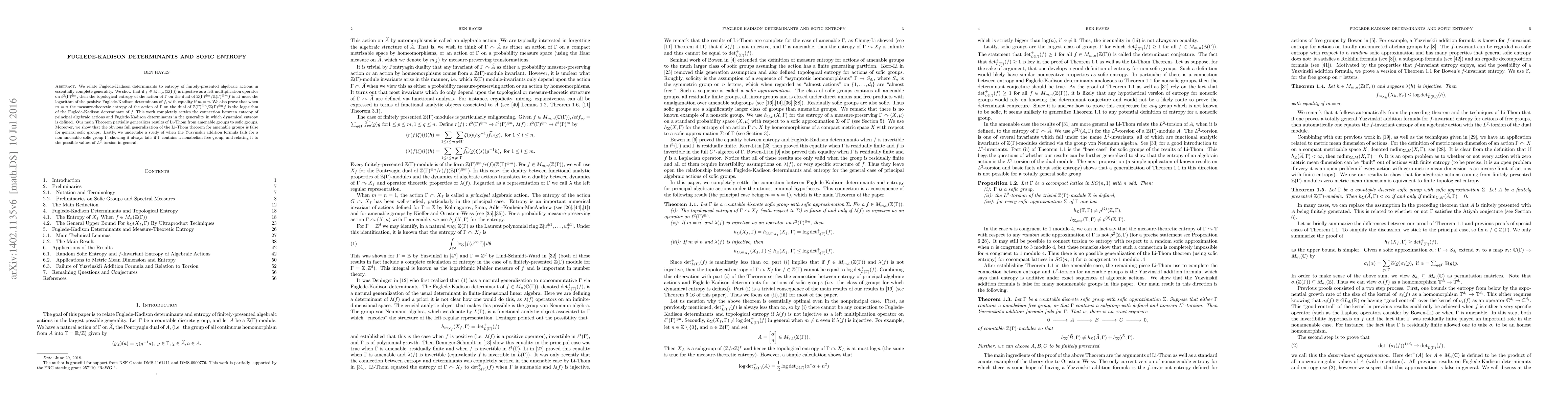 This paper generalizes the connection between Fuglede-Kadison determinants and entropy for algebraic actions of sofic groups, extending previous results from amenable and residually finite cases. The novel proof avoids determinant approximation, and it applies to a problem posed by Christopher Deninger.