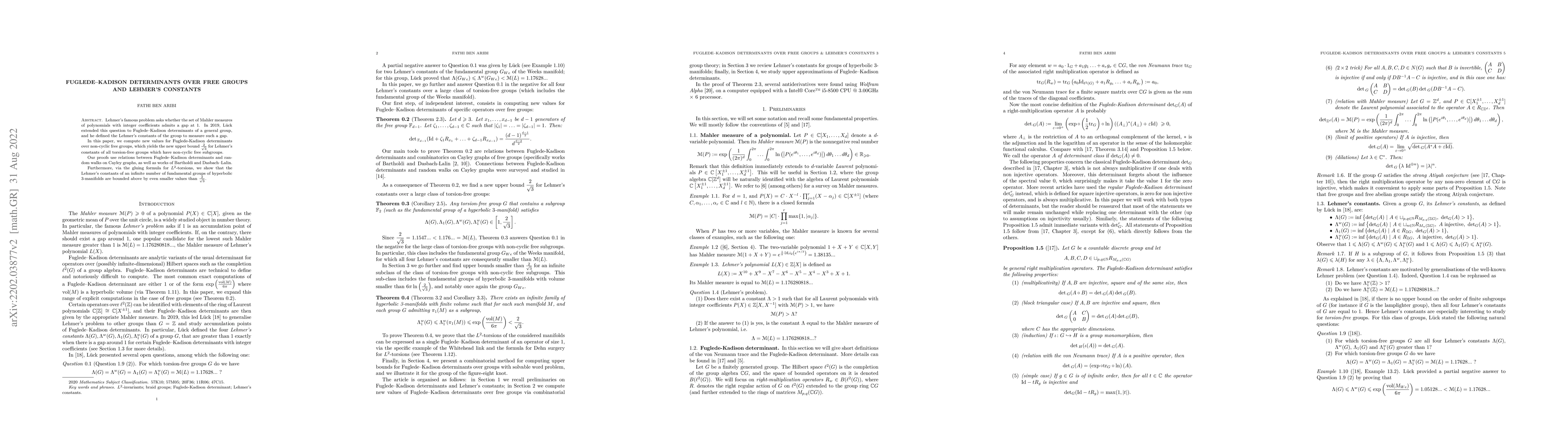 This paper explores Fuglede-Kadison determinants over non-cyclic free groups, establishing a new upper bound of $\frac{2}{\sqrt{3}}$ for Lehmer's constants of torsion-free groups with non-cyclic free subgroups. The findings also demonstrate that the Lehmer's constants for certain hyperbolic 3-manifolds are even smaller, leveraging connections between determinants and random walks on Cayley graphs.