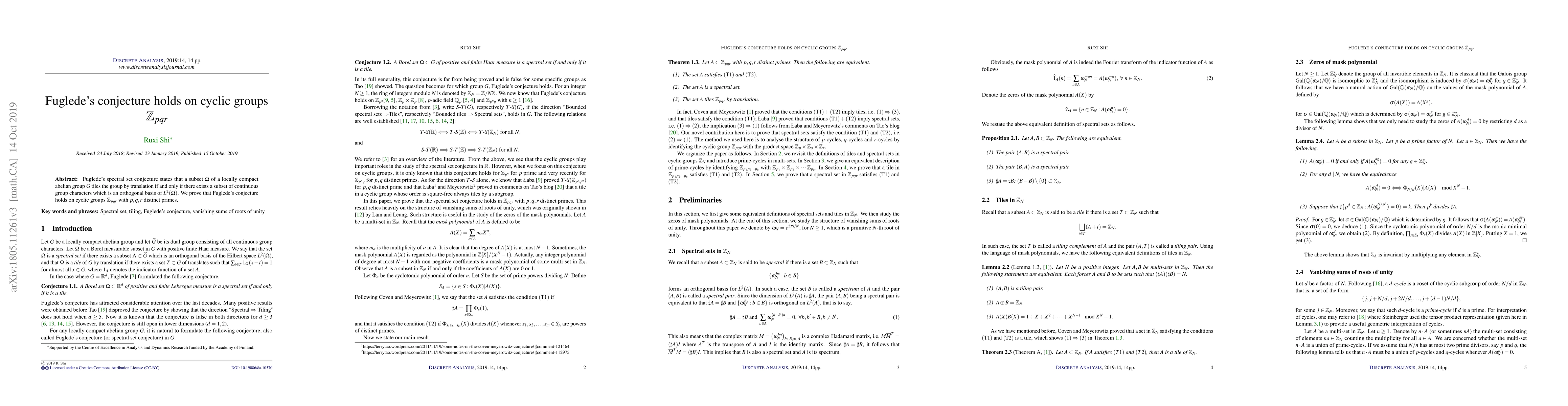 Fuglede's spectral set conjecture is validated for the cyclic group $\mathbb{Z}_{pqr}$, where $p$, $q$, and $r$ are distinct primes, confirming the existence of an orthogonal basis of $L^2(\Omega)$ for tiling by translation.