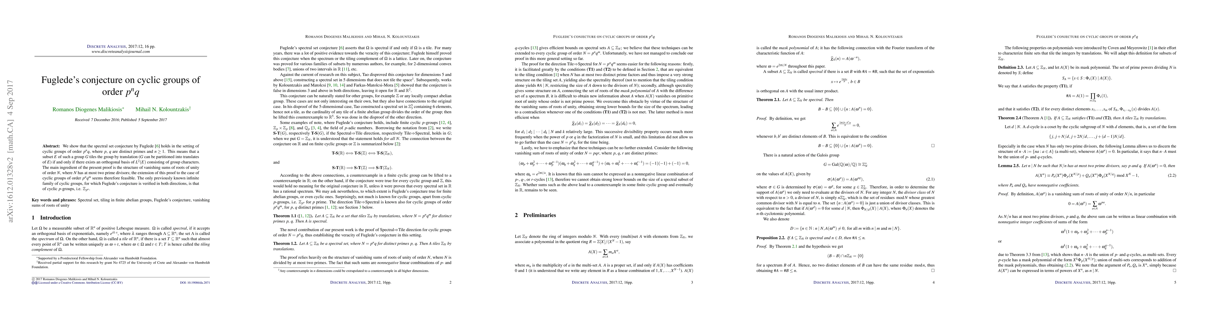 Fuglede's spectral set conjecture is verified for cyclic groups of order $p^n q$ using the structure of vanishing sums of roots of unity. This result extends the previously known verification for cyclic $p$-groups.