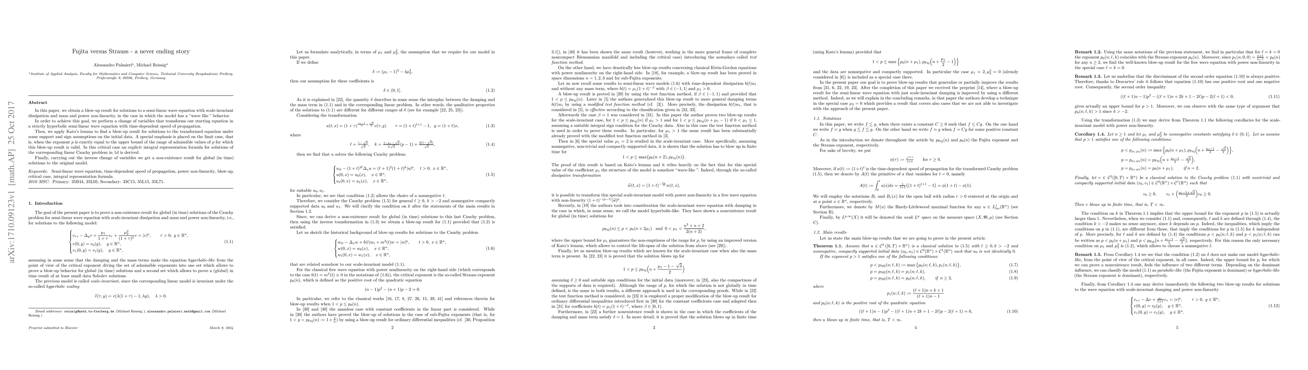 In this paper, we obtain a blow-up result for solutions to a semi-linear wave equation with scale-invariant dissipation and mass and power non-linearity, in the case in which the model has a "wave like" behavior. In order to achieve this goal, we perform a change of variables that transforms our starting equation in a strictly hyperbolic semi-linear wave equation with time-dependent speed of propagation. Then, we apply Kato's lemma to find a blow-up result for solutions to the transformed equation under some support and sign assumptions on the initial data. A special emphasis is placed on the limit case, that is, when the exponent p is exactly equal to the upper bound of the range of admissible values of p for which this blow-up result is valid. In this critical case an explicit integral representation formula for solutions of the corresponding linear Cauchy problem in 1d is derived. Finally, carrying out the inverse change of variables we get a non-existence result for global (in time) solutions to the original model.