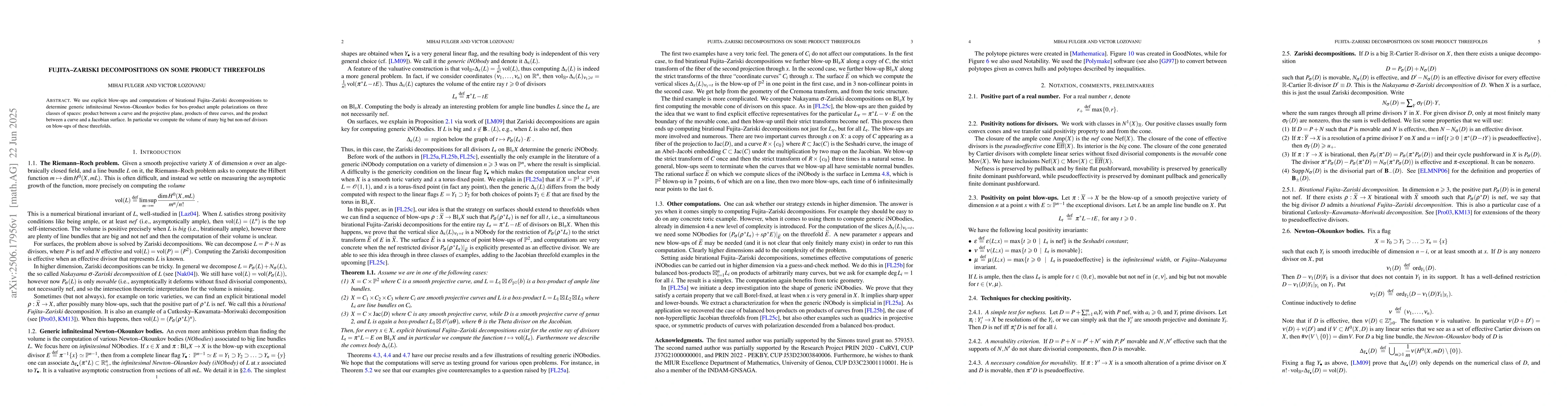 We use explicit blow-ups and computations of birational Fujita-Zariski decompositions to determine generic infinitesimal Newton-Okounkov bodies for box-product ample polarizations on three classes of spaces: product between a curve and the projective plane, products of three curves, and the product between a curve and a Jacobian surface. In particular we compute the volume of many big but non-nef divisors on blow-ups of these threefolds.
