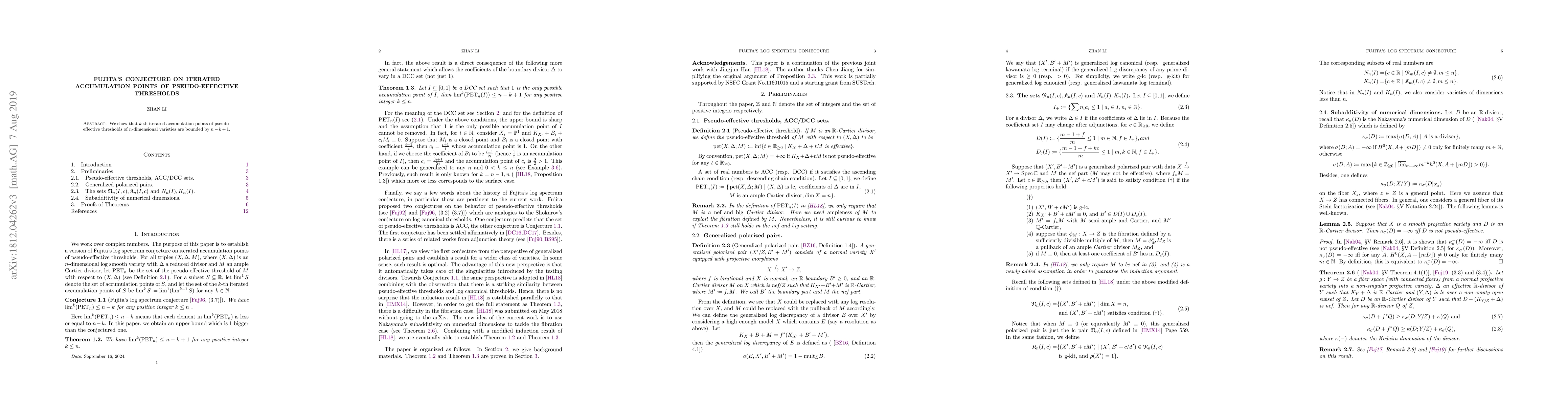 Summary: Fujita's conjecture is proven, demonstrating that the $k$-th iterated accumulation points of pseudo-effective thresholds in $n$-dimensional varieties are bounded by $n-k+1$. This result provides a significant constraint on the behavior of these thresholds in algebraic geometry.