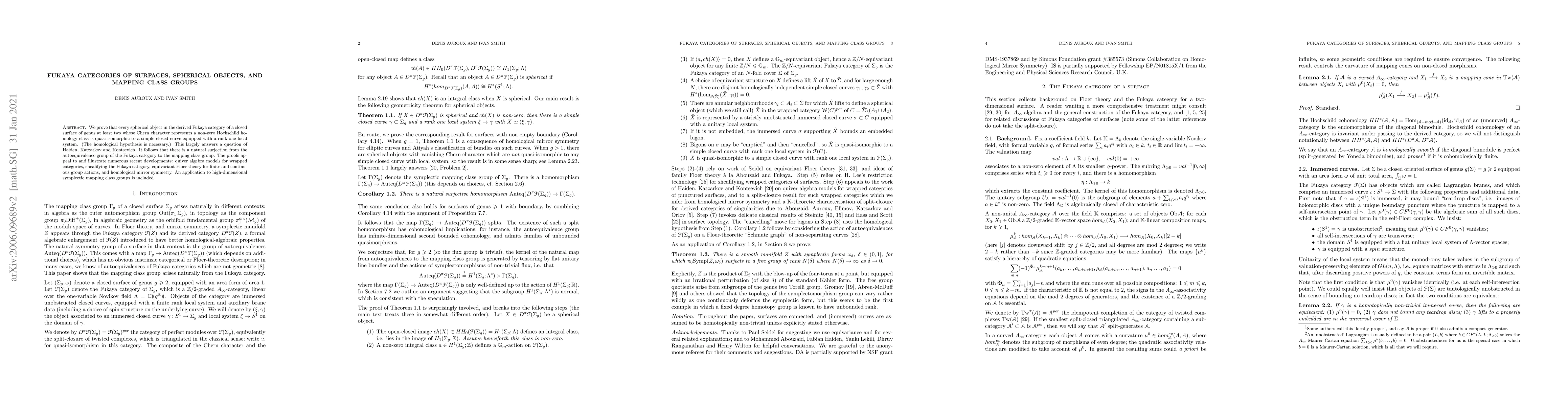 We prove that every spherical object in the derived Fukaya category of a closed surface of genus at least two whose Chern character represents a non-zero Hochschild homology class is quasi-isomorphic to a simple closed curve equipped with a rank one local system. (The homological hypothesis is necessary.) This largely answers a question of Haiden, Katzarkov and Kontsevich. It follows that there is a natural surjection from the autoequivalence group of the Fukaya category to the mapping class group. The proofs appeal to and illustrate numerous recent developments: quiver algebra models for wrapped categories, sheafifying the Fukaya category, equivariant Floer theory for finite and continuous group actions, and homological mirror symmetry. An application to high-dimensional symplectic mapping class groups is included.