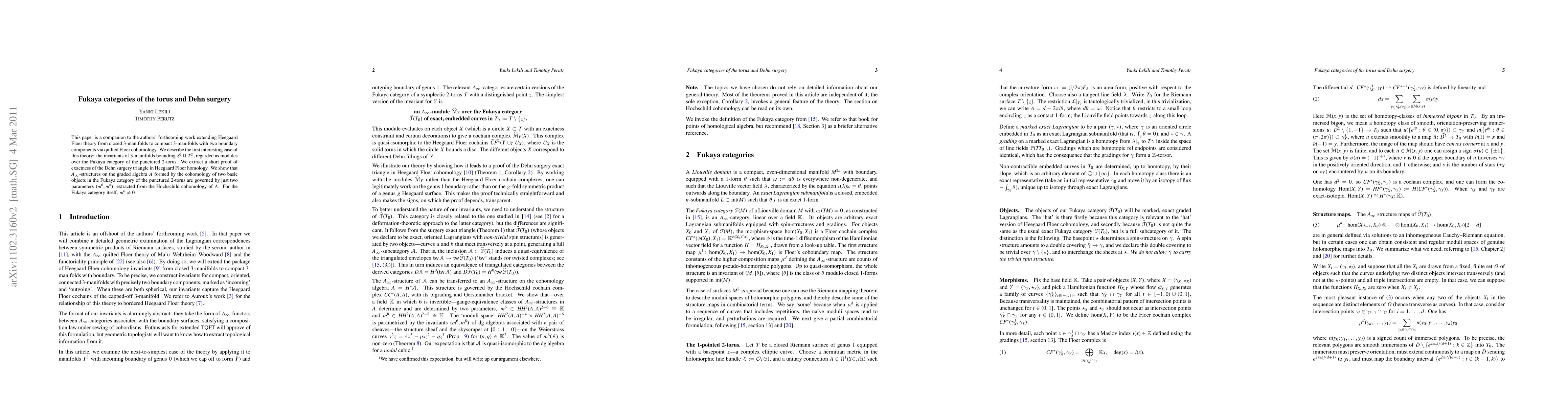 This paper explores the Fukaya categories of the torus and their application to Dehn surgery, proving the exactness of the Dehn surgery triangle in Heegaard Floer homology and showing that A-infinity structures on the graded algebra A are governed by parameters m^6 and m^8.