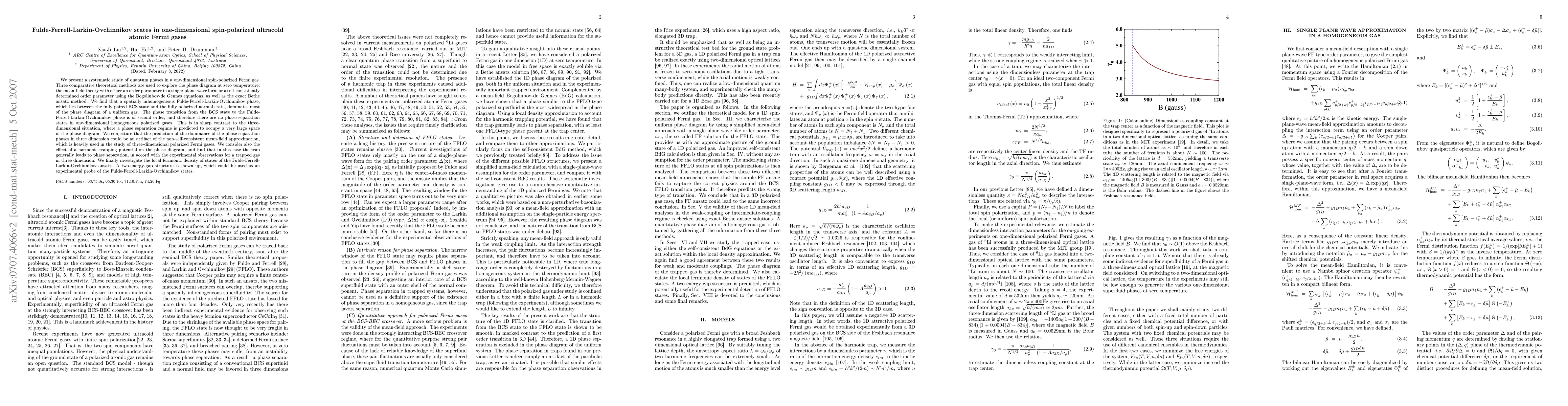 This paper studies quantum phases in a one-dimensional spin-polarized Fermi gas, finding that a Fulde-Ferrell-Larkin-Ovchinnikov phase dominates most of the phase diagram, contrasting with three-dimensional predictions of phase separation. The presence of a harmonic trap leads to phase separation, aligning with experimental observations.