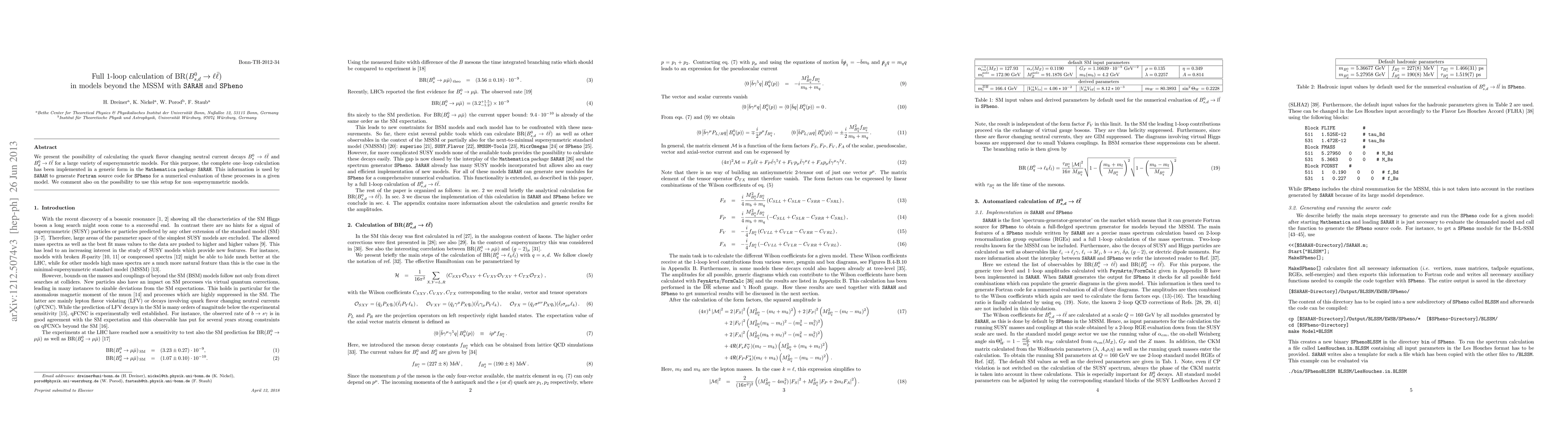 This paper details the implementation of a full 1-loop calculation for the decay rates of $B_{s,d}^0$ into lepton pairs in supersymmetric models beyond the MSSM, using the SARAH and SPheno tools. The methodology allows for the evaluation of these processes in a wide range of supersymmetric and potentially non-supersymmetric models.