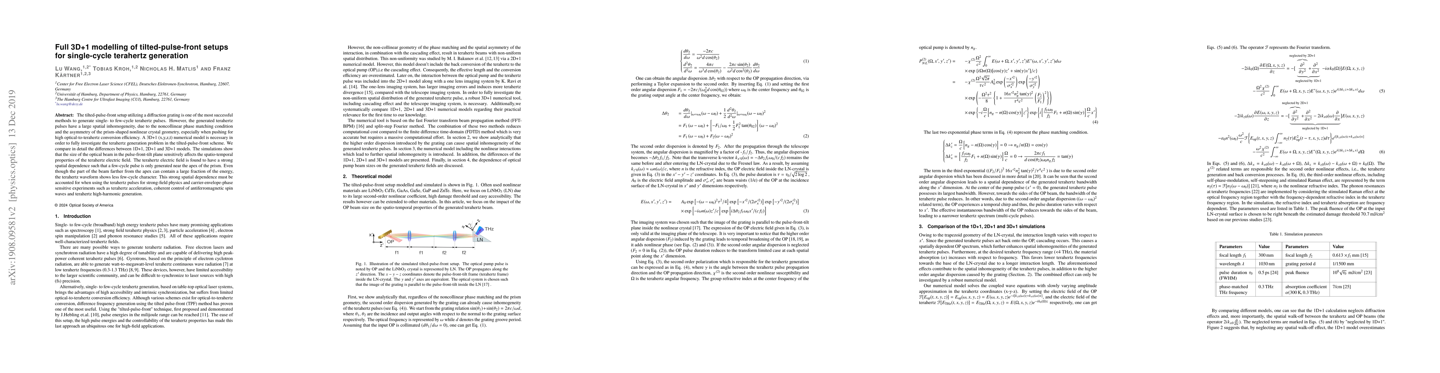 The tilted-pulse-front setup utilizing a diffraction grating is one of the most successful methods to generate single- to few-cycle terahertz pulses. However, the generated terahertz pulses have a large spatial inhomogeneity, due to the noncollinear phase matching condition and the asymmetry of the prism-shaped nonlinear crystal geometry, especially when pushing for high optical-to-terahertz conversion efficiency. A 3D+1 (x,y,z,t) numerical model is necessary in order to fully investigate the terahertz generation problem in the tilted-pulse-front scheme. We compare in detail the differences between 1D+1, 2D+1 and 3D+1 models. The simulations show that the size of the optical beam in the pulse-front-tilt plane sensitively affects the spatio-temporal properties of the terahertz electric field. The terahertz electric field is found to have a strong spatial dependence such that a few-cycle pulse is only generated near the apex of the prism. The part of the beam farther from the apex contains a large fraction of the energy but has a waveform that deviates from a few-cycle. This strong spatial dependence must be accounted for when using the terahertz pulses for strong-field physics and carrier-envelope-phase sensitive experiments such as terahertz acceleration, coherent control of antiferromagnetic spin waves and terahertz high-harmonic generation.