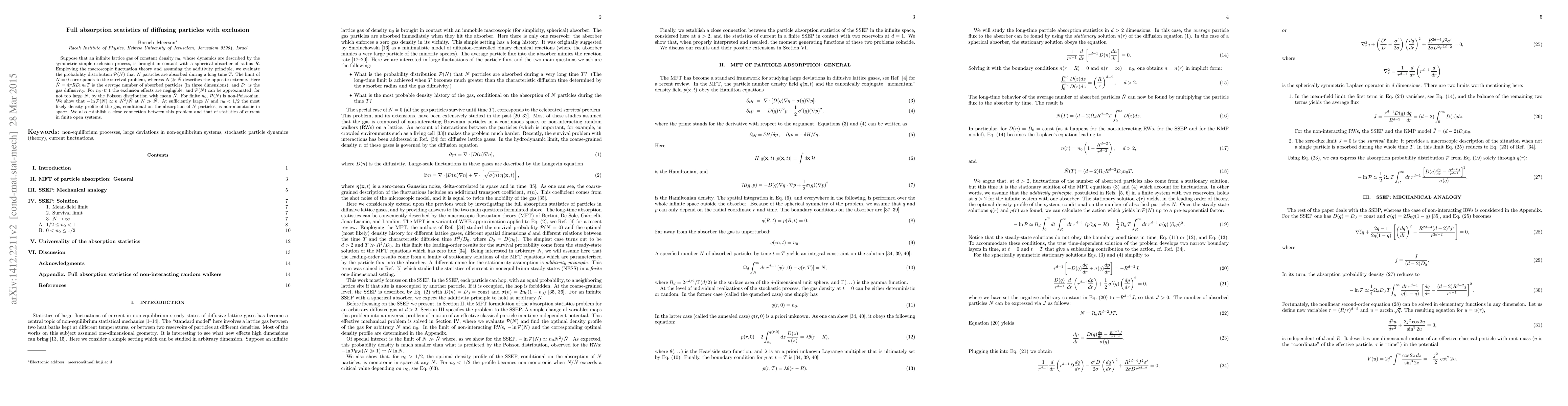Suppose that an infinite lattice gas of constant density $n_0$, whose dynamics are described by the symmetric simple exclusion process, is brought in contact with a spherical absorber of radius $R$. Employing the macroscopic fluctuation theory and assuming the additivity principle, we evaluate the probability distribution ${\mathcal P}(N)$ that $N$ particles are absorbed during a long time $T$. The limit of $N=0$ corresponds to the survival problem, whereas $N\gg \bar{N}$ describes the opposite extreme. Here $\bar{N}=4\pi R D_0 n_0 T$ is the \emph{average} number of absorbed particles (in three dimensions), and $D_0$ is the gas diffusivity. For $n_0\ll 1$ the exclusion effects are negligible, and ${\mathcal P}(N)$ can be approximated, for not too large $N$, by the Poisson distribution with mean $\bar{N}$. For finite $n_0$, ${\mathcal P}(N)$ is non-Poissonian. We show that $-\ln{\mathcal P}(N) \simeq n_0 N^2/\bar{N}$ at $N\gg \bar{N}$. At sufficiently large $N$ and $n_0<1/2$ the most likely density profile of the gas, conditional on the absorption of $N$ particles, is non-monotonic in space. We also establish a close connection between this problem and that of statistics of current in finite open systems.