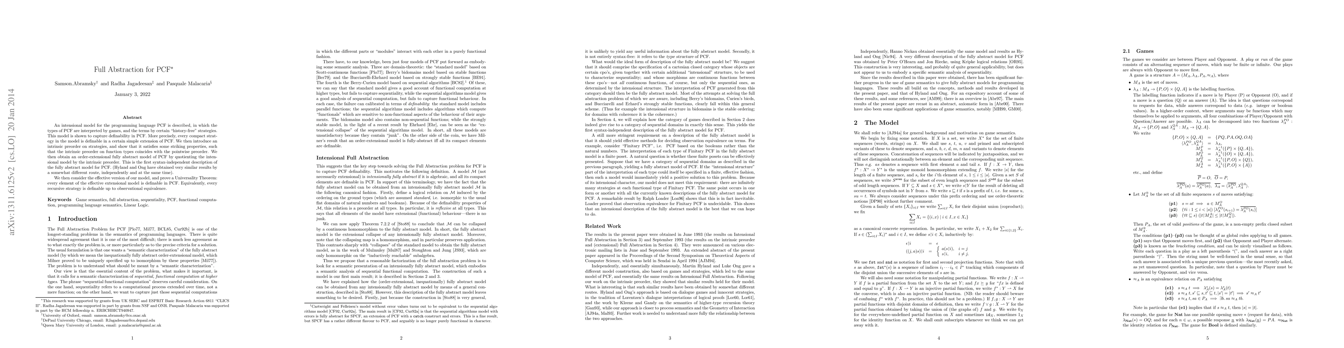 This paper presents an intensional model for PCF where types are interpreted by games and terms by "history-free" strategies, demonstrating that every compact strategy is definable in an extended PCF. It introduces an intrinsic preorder on strategies, showing it aligns with the pointwise preorder, and constructs a fully abstract model by quotienting the intensional model. The authors also prove a Universality Theorem for the effective extensional model, asserting that every recursive strategy is definable in PCF.