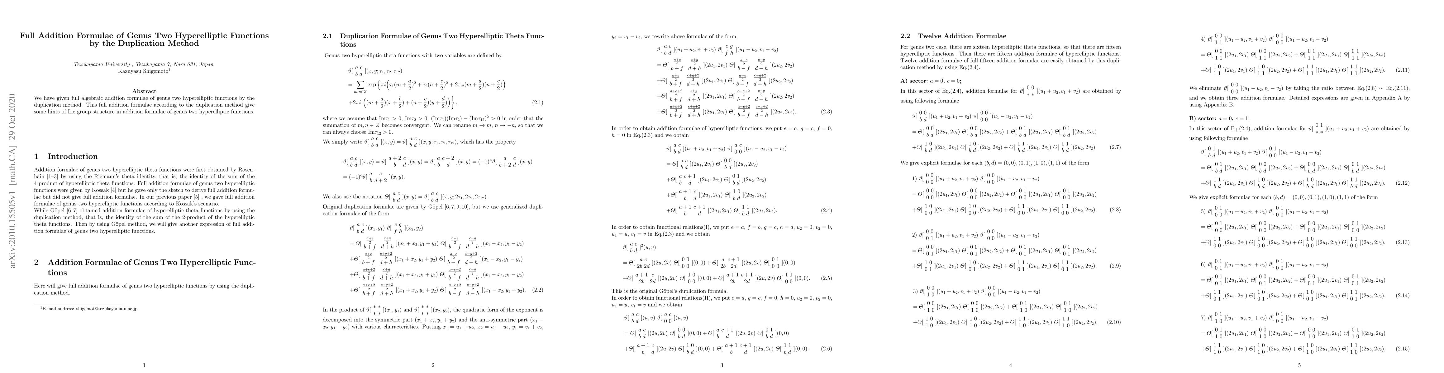 Summary: This paper presents complete algebraic addition formulae for genus two hyperelliptic functions derived via the duplication method, revealing insights into the Lie group structure inherent in these addition formulae.