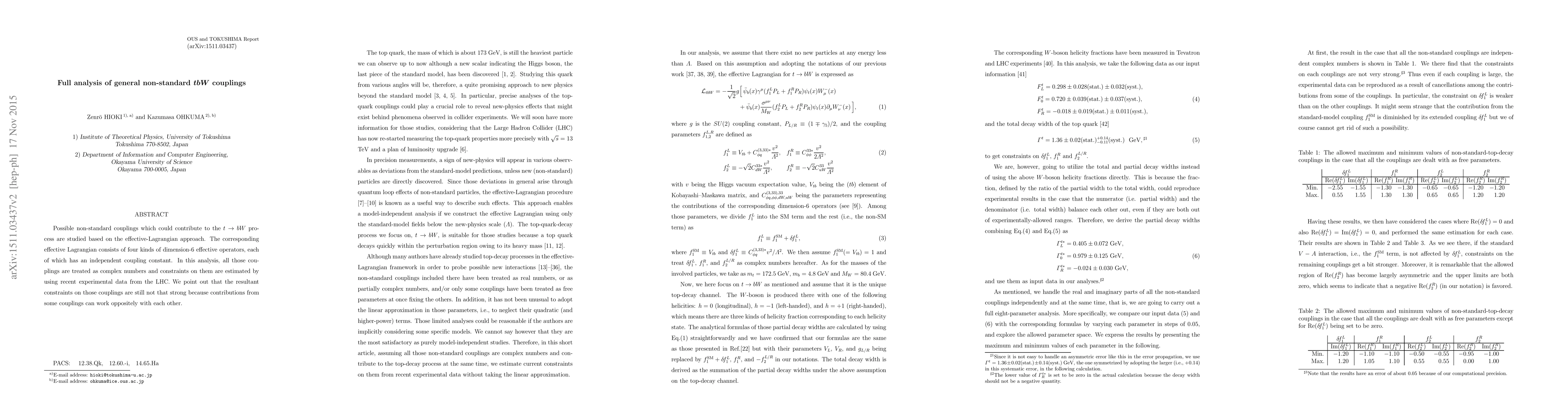 Possible non-standard couplings which could contribute to the t -> b W process are studied based on the effective-Lagrangian approach. The corresponding effective Lagrangian consists of four kinds of dimension-6 effective operators, each of which has an independent coupling constant. In this analysis, all those couplings are treated as complex numbers and constraints on them are estimated by using recent experimental data from the LHC. We point out that the resultant constraints on those couplings are still not that strong because contributions from some couplings can work oppositely with each other.