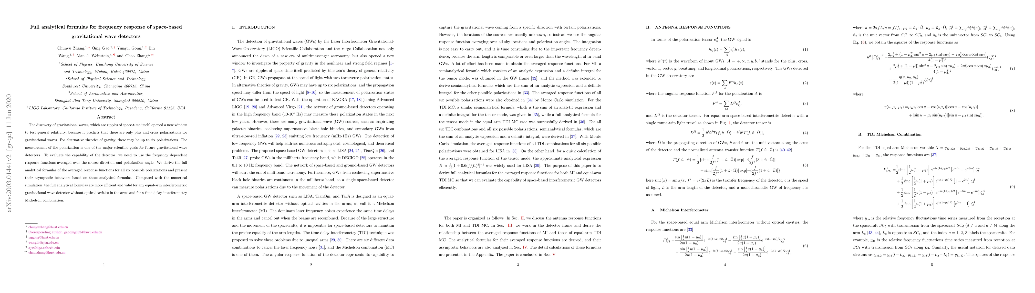 This paper derives full analytical formulas for the frequency response of space-based gravitational wave detectors, providing averaged response functions for all six possible polarizations. These analytical formulas are shown to be more efficient and valid compared to numerical simulations for various detector types.
