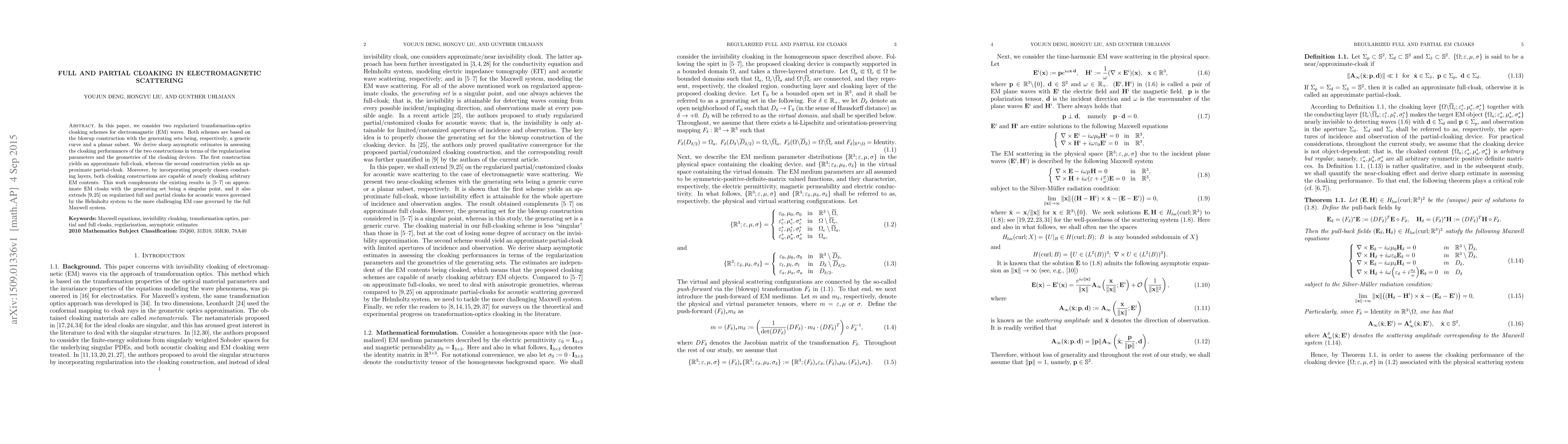 This paper explores two transformation-optics cloaking schemes for electromagnetic waves, assessing their performances through regularization parameters and geometries. The first scheme nearly achieves full-cloaking, while the second provides partial-cloaking, both enhanced by conducting layers. The work extends previous results on acoustic cloaking to the electromagnetic domain.