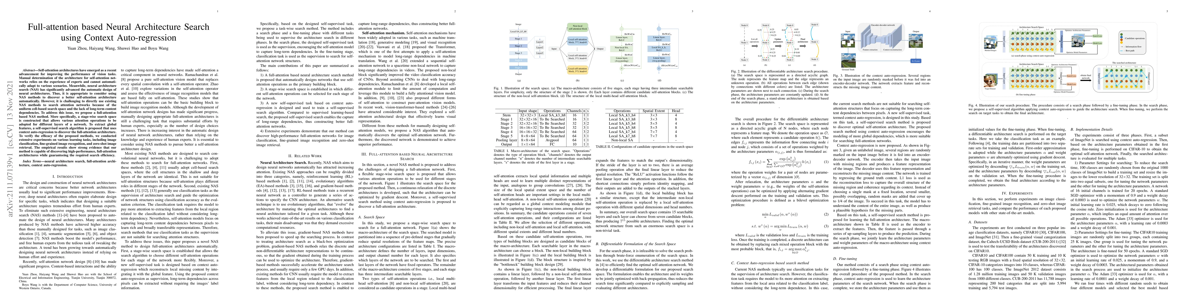 This paper proposes a neural architecture search (NAS) method for discovering self-attention networks that can adapt to various vision tasks by using a stage-wise search space and a self-supervised algorithm with context auto-regression. Experiments demonstrate the effectiveness of the method in finding high-performance full-attention architectures efficiently.