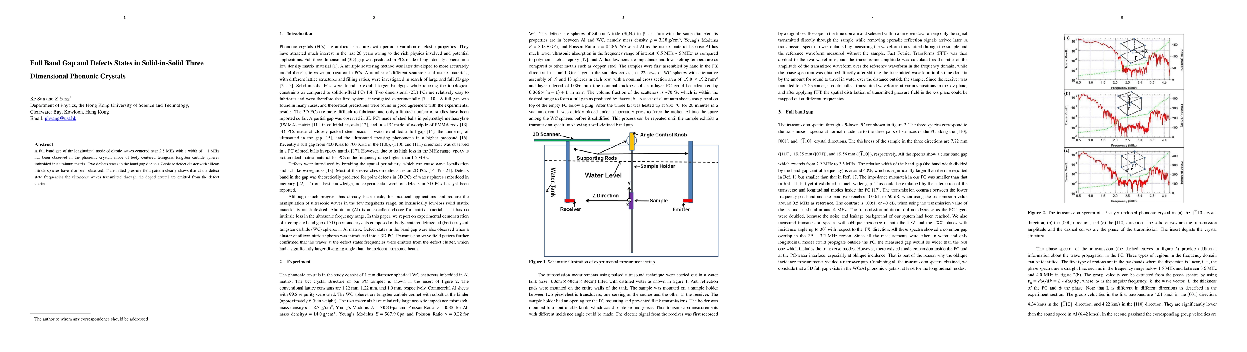 A full band gap of the longitudinal mode of elastic waves centered near 2.8 MHz with a width of ~ 1 MHz has been observed in the phononic crystals made of body centered tetragonal tungsten carbide spheres imbedded in aluminum matrix. Two defects states in the band gap due to a 7-sphere defect cluster with silicon nitride spheres have also been observed. Transmitted pressure field pattern clearly shows that at the defect state frequencies the ultrasonic waves transmitted through the doped crystal are emitted from the defect cluster.