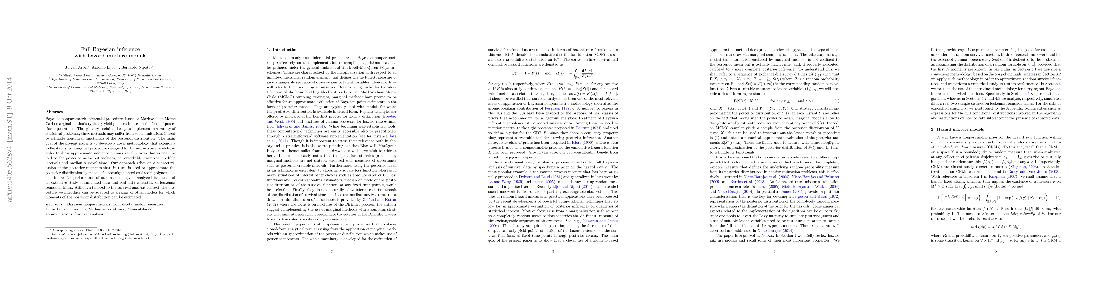 This paper develops a novel Bayesian methodology for full inference in hazard mixture models, extending marginal procedures to provide credible intervals and median survival time, rather than just posterior means. The approach uses Jacobi polynomials to approximate the posterior distribution, demonstrated through simulations and real leukemia remission data.