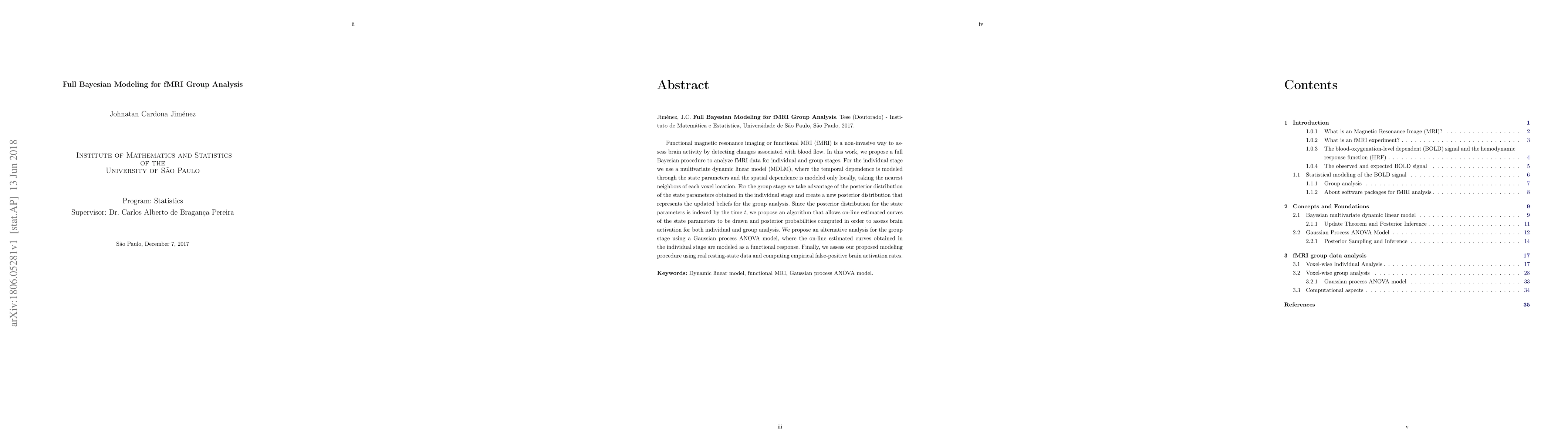 Functional magnetic resonance imaging or functional MRI (fMRI) is a non-invasive way to assess brain activity by detecting changes associated with blood flow. In this work, we propose a full Bayesian procedure to analyze fMRI data for individual and group stages. For the individual stage we use a multivariate dynamic linear model (MDLM), where the temporal dependence is modeled through the state parameters and the spatial dependence is modeled only locally, taking the nearest neighbors of each voxel location. For the group stage we take advantage of the posterior distribution of the state parameters obtained in the individual stage and create a new posterior distribution that represents the updated beliefs for the group analysis. Since the posterior distribution for the state parameters is indexed by the time $t$, we propose an algorithm that allows on-line estimated curves of the state parameters to be drawn and posterior probabilities computed in order to assess brain activation for both individual and group analysis. We propose an alternative analysis for the group stage using a Gaussian process ANOVA model, where the on-line estimated curves obtained in the individual stage are modeled as a functional response. Finally, we assess our proposed modeling procedure using real resting-state data and computing empirical false-positive brain activation rates.