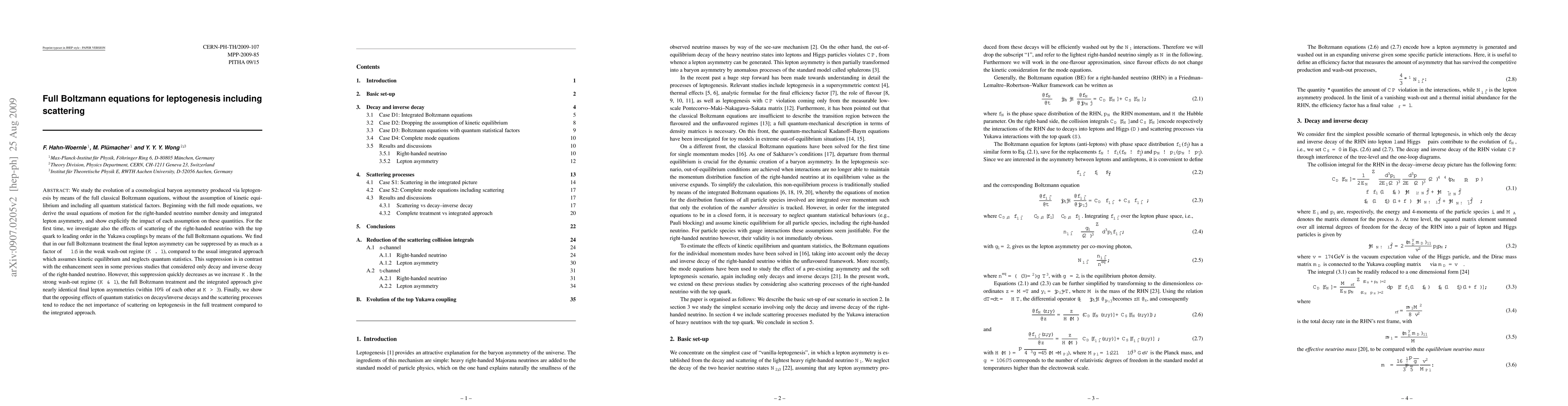 This paper investigates the evolution of cosmological baryon asymmetry via leptogenesis using full Boltzmann equations, including scattering effects and quantum statistical factors. It finds that scattering can suppress the final lepton asymmetry by up to 50% in the weak wash-out regime, but this effect diminishes in the strong wash-out regime, where both full and integrated approaches yield similar results.