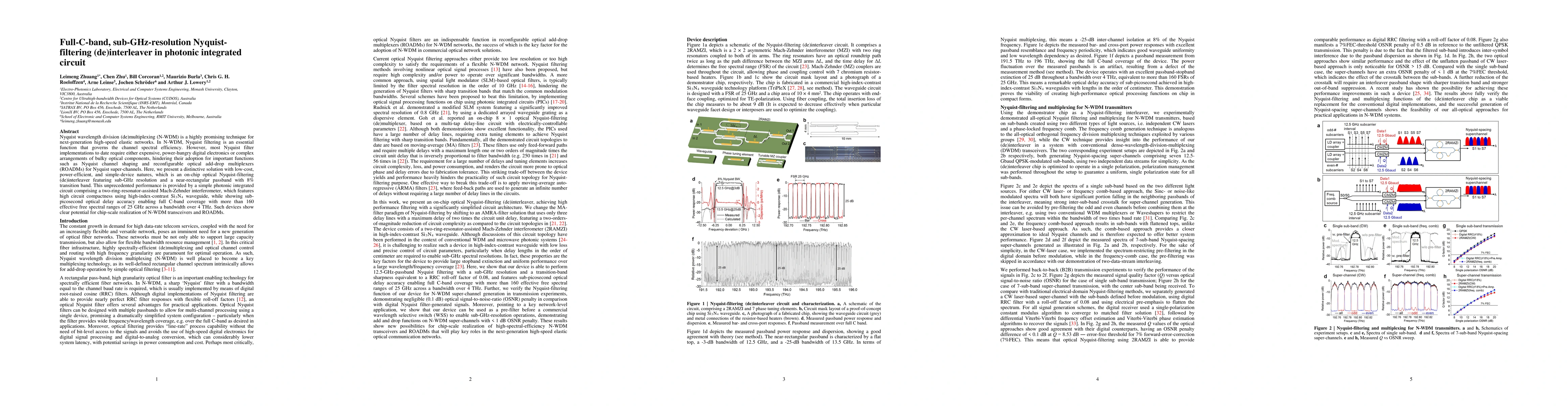 This paper presents a low-cost, power-efficient photonic integrated circuit for Nyquist filtering and deinterleaving with sub-GHz resolution, utilizing a two-ring-resonator-assisted Mach-Zehnder interferometer in a compact Si3N4 waveguide. The device offers full C-band coverage and high spectral efficiency, promising applications in next-generation high-speed elastic networks.