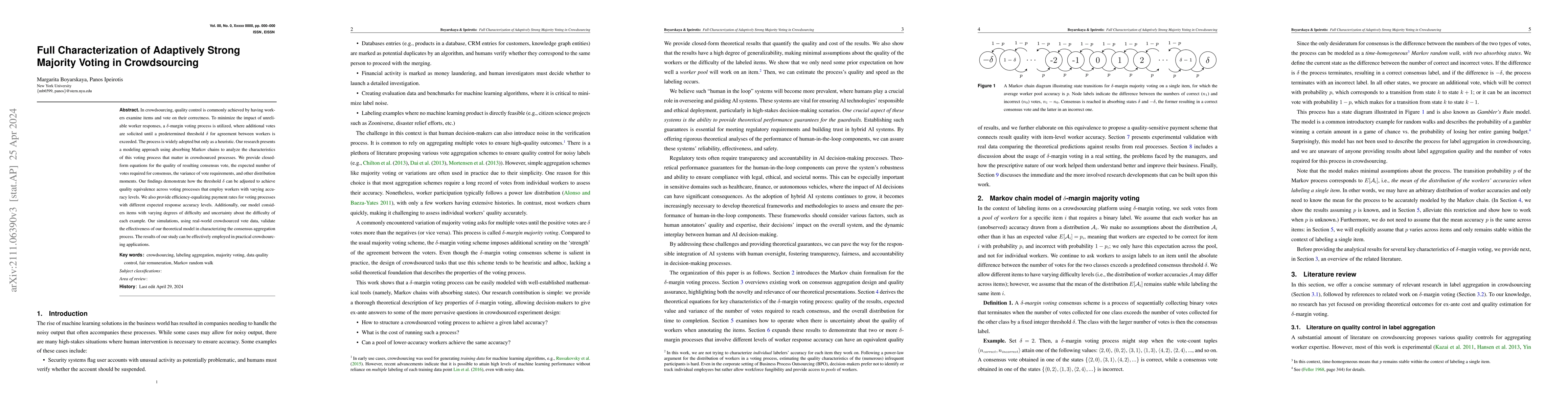 This research models adaptively strong majority voting in crowdsourcing using absorbing Markov chains, deriving equations for consensus quality, vote count, and variance. It demonstrates how adjusting the agreement threshold can balance quality across workers of varying accuracy and proposes payment rates to equalize efficiency, validated through real-world data simulations.