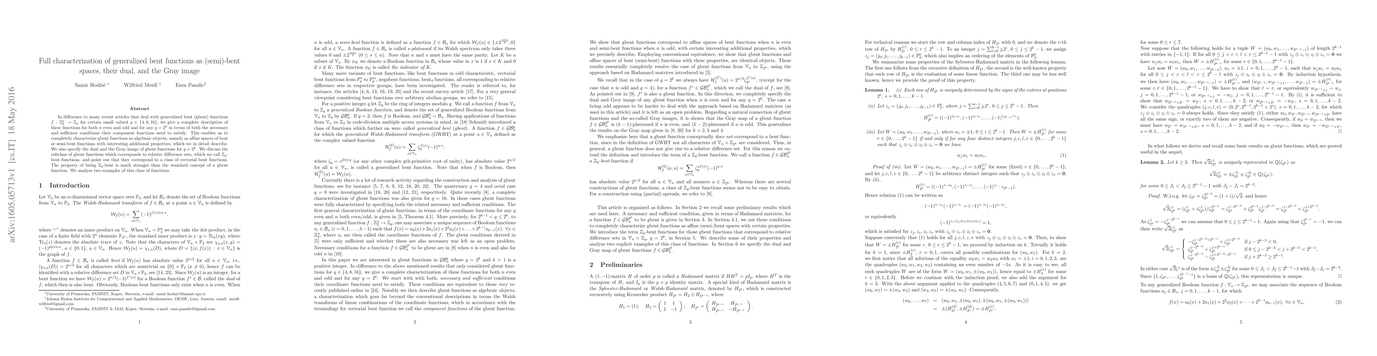 In difference to many recent articles that deal with generalized bent (gbent) functions $f:\mathbb{Z}_2^n \rightarrow \mathbb{Z}_q$ for certain small valued $q\in \{4,8,16 \}$, we give a complete description of these functions for both $n$ even and odd and for any $q=2^k$ in terms of both the necessary and sufficient conditions their component functions need to satisfy. This enables us to completely characterize gbent functions as algebraic objects, namely as affine spaces of bent or semi-bent functions with interesting additional properties, which we in detail describe. We also specify the dual and the Gray image of gbent functions for $q=2^k$. We discuss the subclass of gbent functions which corresponds to relative difference sets, which we call $\mathbb{Z}_q$-bent functions, and point out that they correspond to a class of vectorial bent functions. The property of being $\mathbb{Z}_q$-bent is much stronger than the standard concept of a gbent function. We analyse two examples of this class of functions.