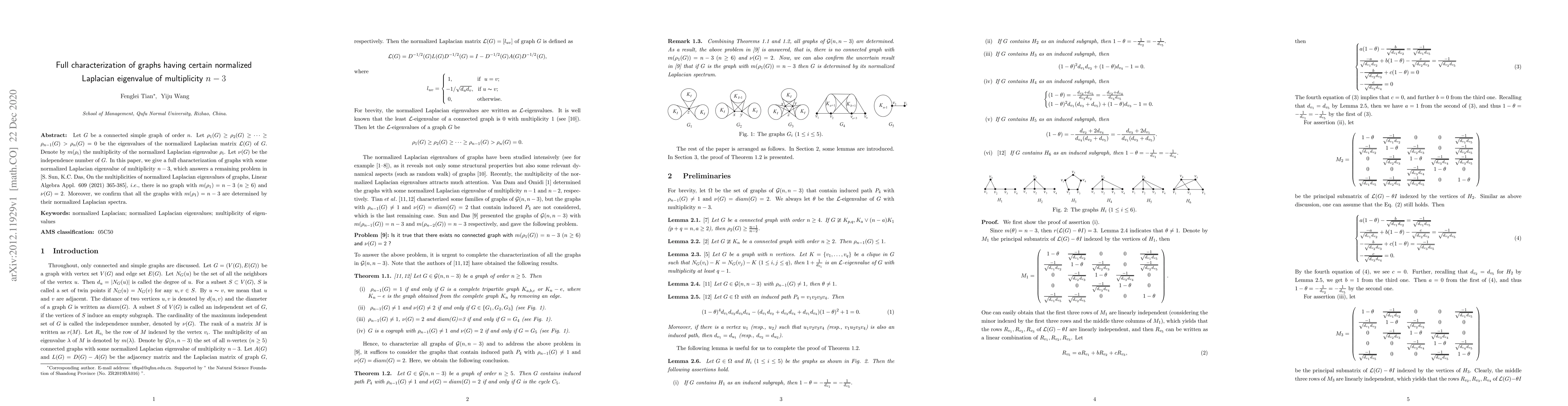 This paper fully characterizes connected simple graphs where a normalized Laplacian eigenvalue has multiplicity $n-3$, resolving a prior problem about such graphs having an independence number of 2. It confirms that these graphs are uniquely determined by their normalized Laplacian spectra.