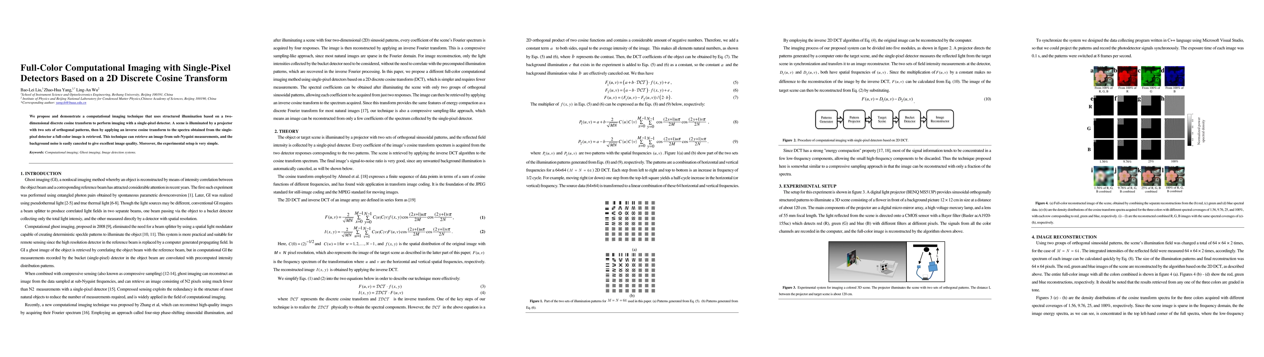 This paper introduces a computational imaging method using structured illumination and a 2D discrete cosine transform for single-pixel detectors, enabling full-color imaging with sub-Nyquist measurements and simple experimental setup. The technique retrieves high-quality images by applying an inverse cosine transform to detector spectra, effectively canceling background noise.