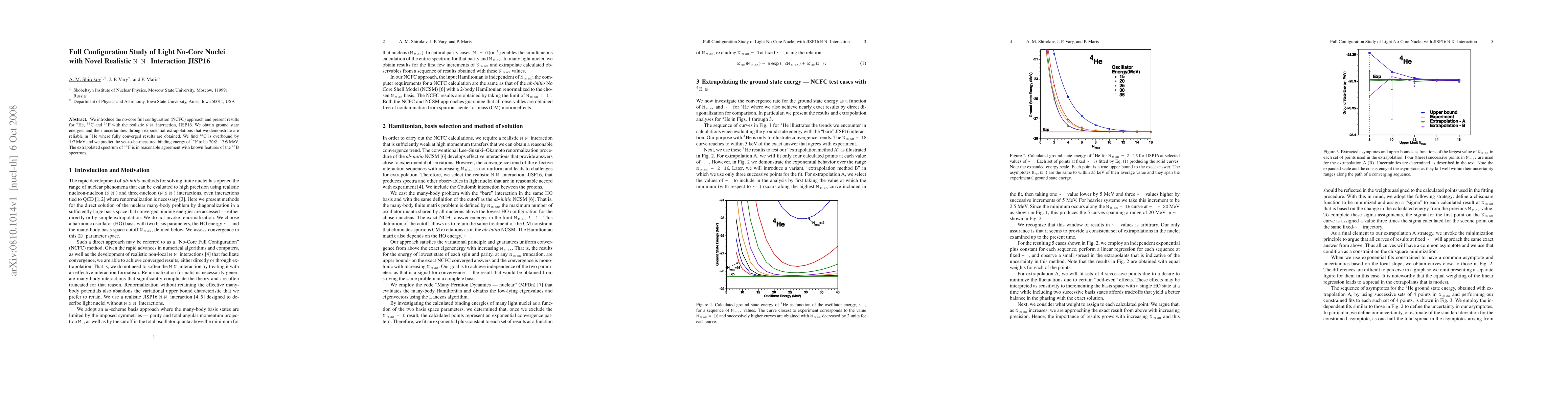 We introduce the no-core full configuration (NCFC) approach and present results for $^4$He, $^{12}$C and $^{14}$F with the realistic NN interaction, JISP16. We obtain ground state energies and their uncertainties through exponential extrapolations that we demonstrate are reliable in $^4$He where fully converged results are obtained. We find $^{12}$C is overbound by 1.7 MeV and we predict the yet-to-be-measured binding energy of $^{14}$F to be $70.2\pm 3.5$ MeV. The extrapolated spectrum of $^{14}$F is in reasonable agreement with known features of the $^{14}$B spectrum.