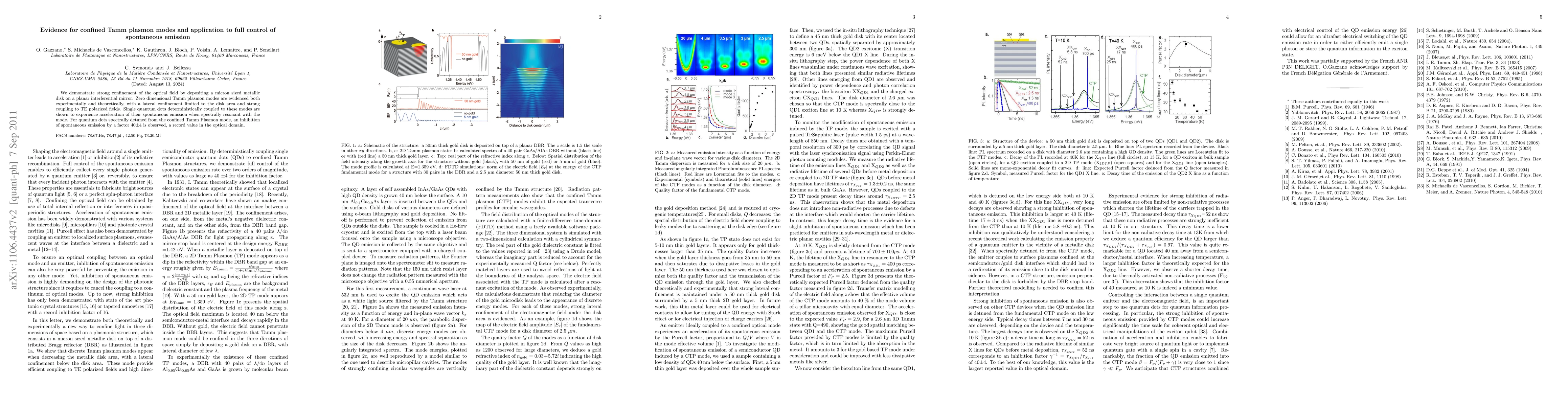 This paper demonstrates strong optical field confinement using a micron-sized metallic disk on an interferential mirror, showing zero-dimensional Tamm plasmon modes. Quantum dots coupled to these modes exhibit significantly accelerated or inhibited spontaneous emission depending on spectral resonance, achieving a record 40-fold inhibition for detuned dots.