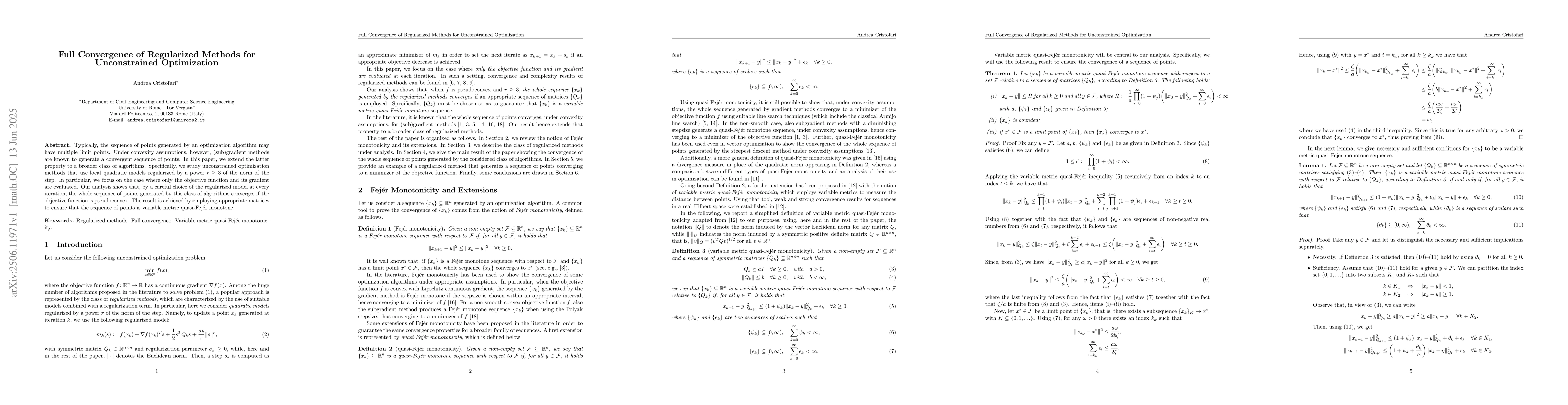 Typically, the sequence of points generated by an optimization algorithm may have multiple limit points. Under convexity assumptions, however, (sub)gradient methods are known to generate a convergent sequence of points. In this paper, we extend the latter property to a broader class of algorithms. Specifically, we study unconstrained optimization methods that use local quadratic models regularized by a power $r \ge 3$ of the norm of the step. In particular, we focus on the case where only the objective function and its gradient are evaluated. Our analysis shows that, by a careful choice of the regularized model at every iteration, the whole sequence of points generated by this class of algorithms converges if the objective function is pseudoconvex. The result is achieved by employing appropriate matrices to ensure that the sequence of points is variable metric quasi-Fej\'er monotone.