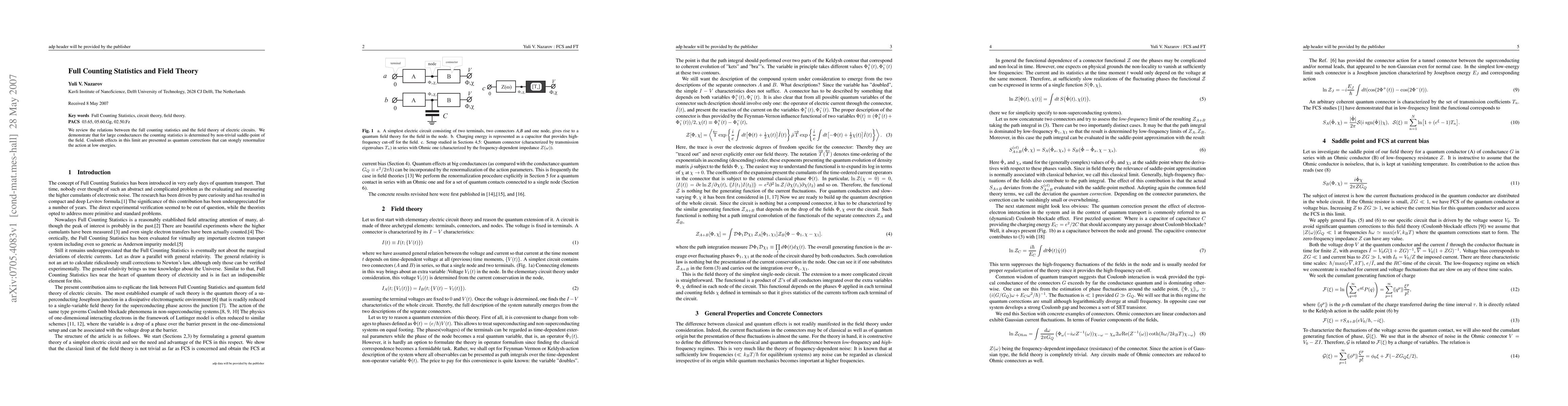 This paper reviews the connection between full counting statistics and field theory in electric circuits, showing that large conductances lead to counting statistics governed by non-trivial saddle-point solutions in the field, with Coulomb effects acting as significant quantum corrections that renormalize low-energy actions.