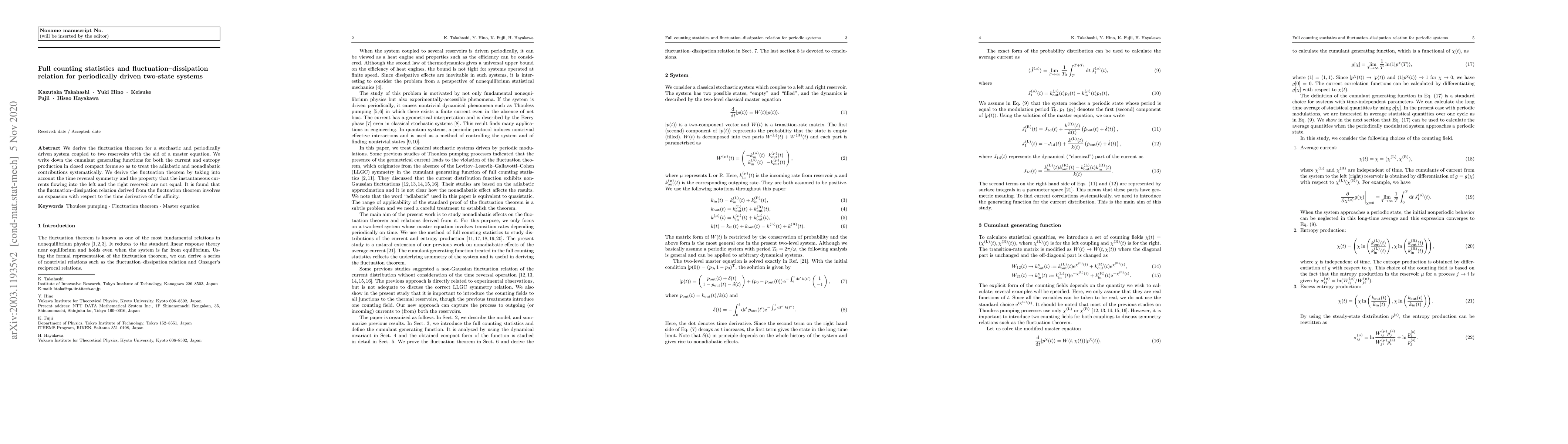 This paper derives a fluctuation theorem for periodically driven two-state systems coupled to two reservoirs, using a master equation. It systematically treats adiabatic and nonadiabatic contributions through closed-form cumulant generating functions and finds that the fluctuation-dissipation relation involves an expansion based on the time derivative of the affinity.