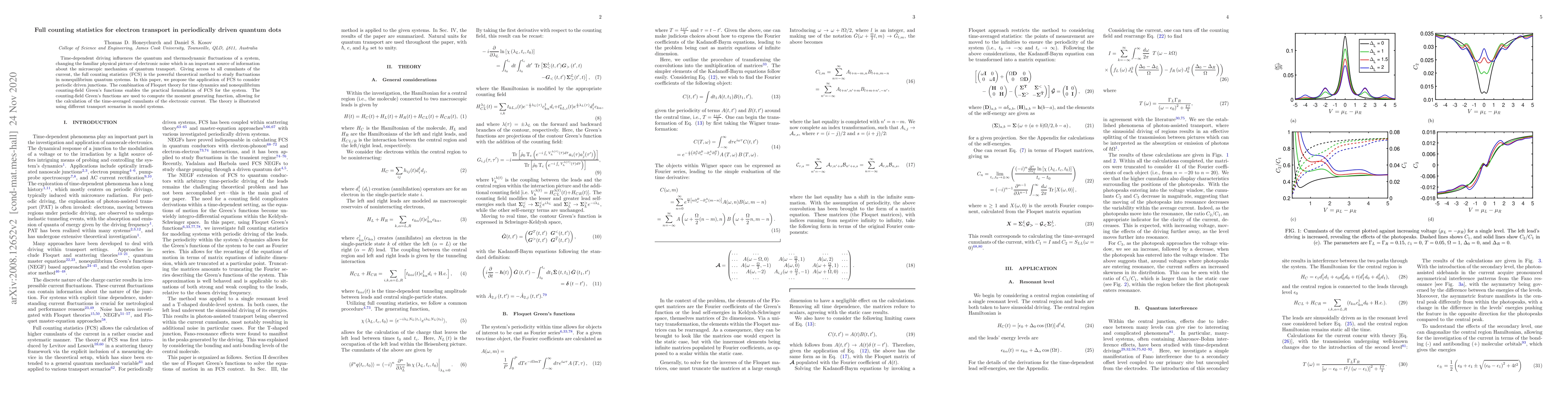 This paper proposes using full counting statistics (FCS) to analyze electron transport in periodically driven quantum dots, combining Floquet theory and nonequilibrium counting-field Green's functions to compute time-averaged cumulants of the current, providing insights into the quantum and thermodynamic fluctuations in nonequilibrium quantum systems. The theoretical framework is demonstrated through various transport scenarios in model systems.