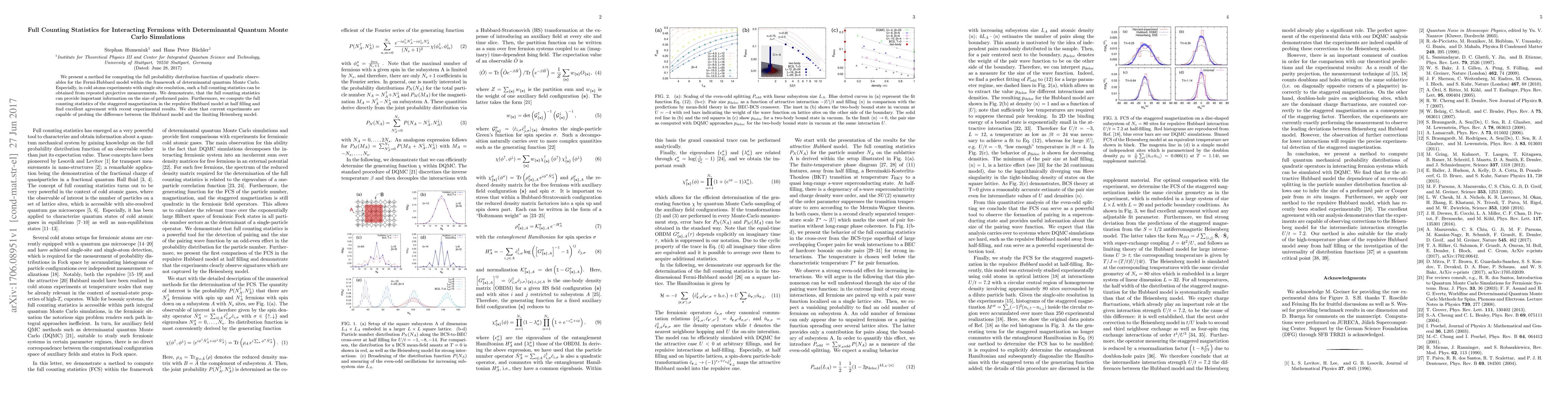 We present a method for computing the full probability distribution function of quadratic observables for the Fermi-Hubbard model within the framework of determinantal quantum Monte Carlo. Especially, in cold atoms experiments with single site resolution, such full counting statistics can be obtained from repeated projective measurements. We demonstrate, that the full counting statistics can provide important information on the size of preformed pairs. Furthermore, we compute the full counting statistics of the staggered magnetization in the repulsive Hubbard model at half filling and find excellent agreement with recent experimental results. We show that current experiments are capable of probing the difference between the Hubbard model and the limiting Heisenberg model.