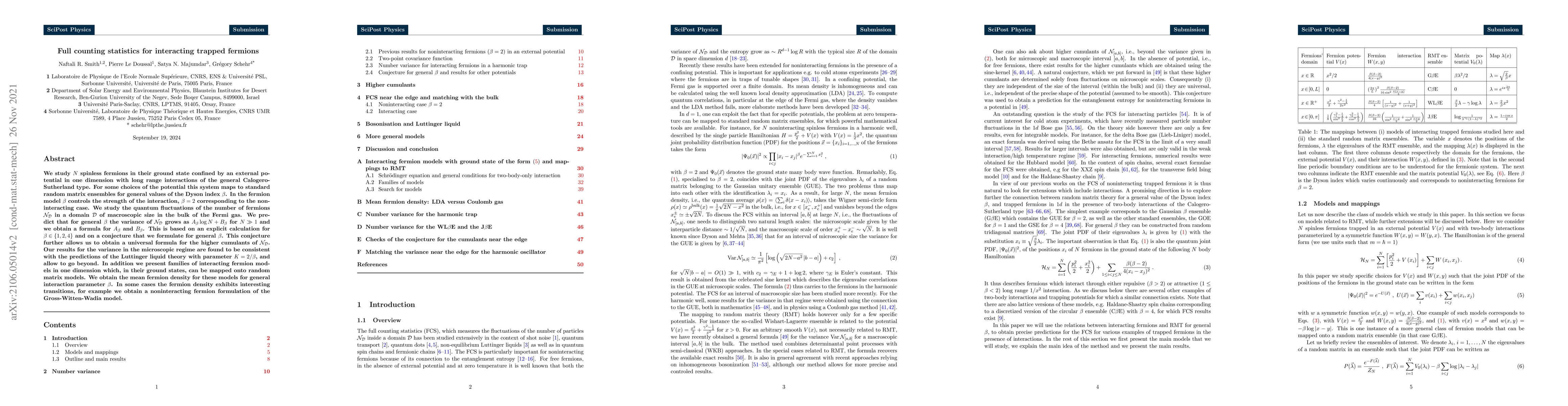 We study $N$ spinless fermions in their ground state confined by an external potential in one dimension with long range interactions of the general Calogero-Sutherland type. For some choices of the potential this system maps to standard random matrix ensembles for general values of the Dyson index $\beta$. In the fermion model $\beta$ controls the strength of the interaction, $\beta=2$ corresponding to the noninteracting case. We study the quantum fluctuations of the number of fermions ${\cal N}_{\cal D}$ in a domain $\cal{D}$ of macroscopic size in the bulk of the Fermi gas. We predict that for general $\beta$ the variance of ${\cal N}_{\cal D}$ grows as $A_{\beta} \log N + B_{\beta}$ for $N \gg 1$ and we obtain a formula for $A_\beta$ and $B_\beta$. This is based on an explicit calculation for $\beta\in\left\{ 1,2,4\right\} $ and on a conjecture that we formulate for general $\beta$. This conjecture further allows us to obtain a universal formula for the higher cumulants of ${\cal N}_{\cal D}$. Our results for the variance in the microscopic regime are found to be consistent with the predictions of the Luttinger liquid theory with parameter $K = 2/\beta$, and allow to go beyond. In addition we present families of interacting fermion models in one dimension which, in their ground states, can be mapped onto random matrix models. We obtain the mean fermion density for these models for general interaction parameter $\beta$. In some cases the fermion density exhibits interesting transitions, for example we obtain a noninteracting fermion formulation of the Gross-Witten-Wadia model.