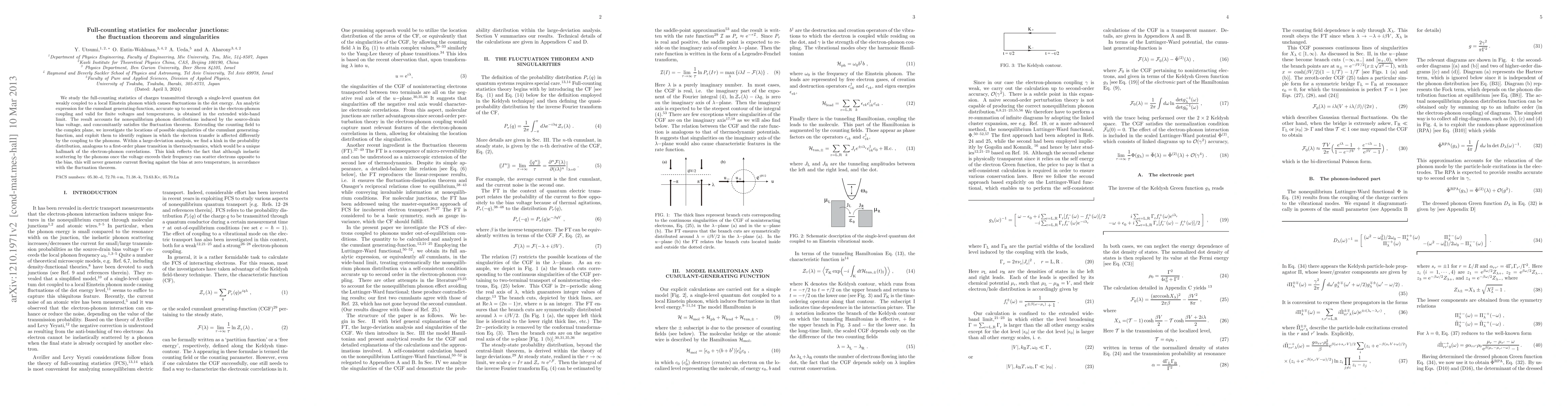 We study the full-counting statistics of charges transmitted through a single-level quantum dot weakly coupled to a local Einstein phonon which causes fluctuations in the dot energy. An analytic expression for the cumulant generating function, accurate up to second order in the electron-phonon coupling and valid for finite voltages and temperatures, is obtained in the extended wide-band limit. The result accounts for nonequilibrium phonon distributions induced by the source-drain bias voltage, and concomitantly satisfies the fluctuation theorem. Extending the counting field to the complex plane, we investigate the locations of possible singularities of the cumulant generating function, and exploit them to identify regimes in which the electron transfer is affected differently by the coupling to the phonons. Within a large-deviation analysis, we find a kink in the probability distribution, analogous to a first-order phase transition in thermodynamics, which would be a unique hallmark of the electron-phonon correlations. This kink reflects the fact that although inelastic scattering by the phonons once the voltage exceeds their frequency can scatter electrons opposite to the bias, this will never generate current flowing against the bias at zero temperature, in accordance with the fluctuation theorem.