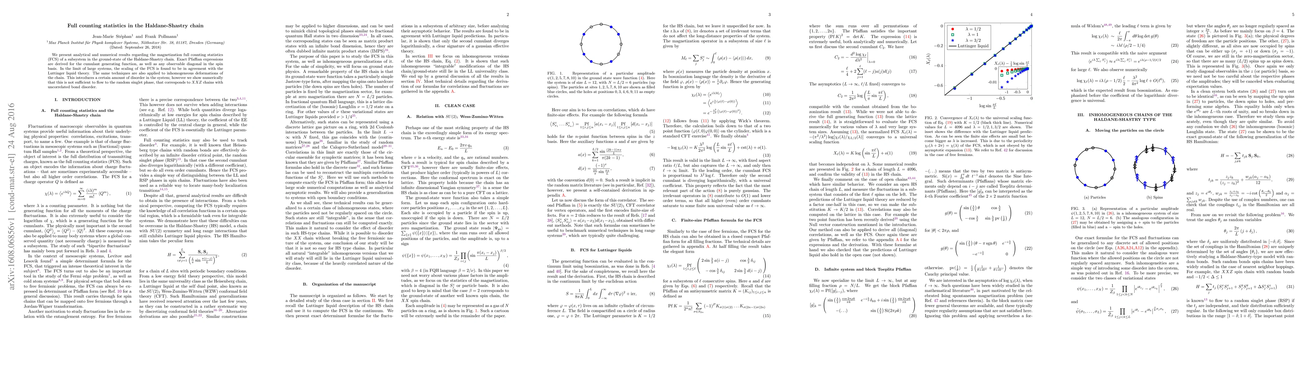 We present analytical and numerical results regarding the magnetization full counting statistics (FCS) of a subsystem in the ground-state of the Haldane-Shastry chain. Exact Pfaffian expressions are derived for the cumulant generating function, as well as any observable diagonal in the spin basis. In the limit of large systems, the scaling of the FCS is found to be in agreement with the Luttinger liquid theory. The same techniques are also applied to inhomogeneous deformations of the chain. This introduces a certain amount of disorder in the system; however we show numerically that this is not sufficient to flow to the random singlet phase, that corresponds to $XXZ$ chains with uncorrelated bond disorder.