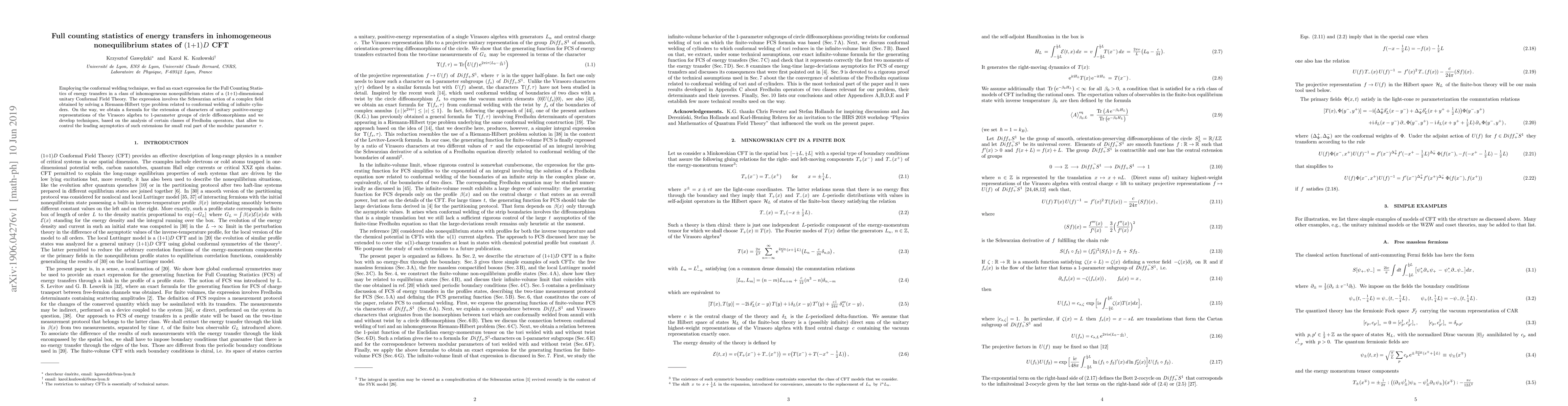 Employing the conformal welding technique, we find an exact expression for the Full Counting Statistics of energy transfers in a class of inhomogeneous nonequilibrium states of a (1+1)-dimensional unitary Conformal Field Theory. The expression involves the Schwarzian action of a complex field obtained by solving a Riemann-Hilbert type problem related to conformal welding of infinite cylinders. On the way, we obtain a formula for the extension of characters of unitary positive-energy representations of the Virasoro algebra to 1-parameter groups of circle diffeomorphisms and we develop techniques, based on the analysis of certain classes of Fredholm operators, that allow to control the leading asymptotics of such extensions for small real part of the modular parameter \tau