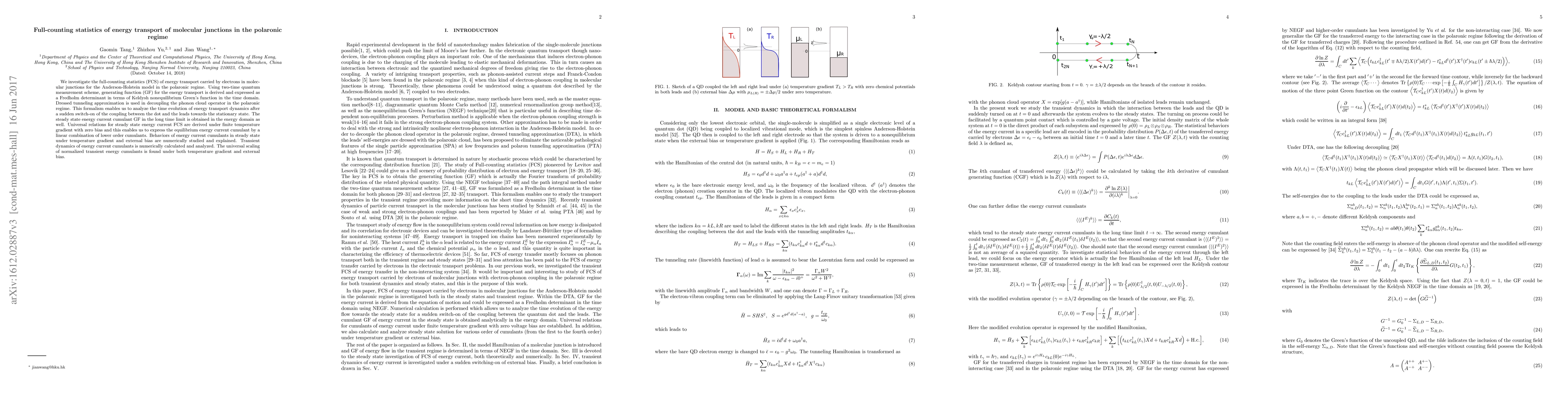 This paper investigates the full-counting statistics of energy transport in molecular junctions using the Anderson-Holstein model in the polaronic regime, deriving a generating function for energy transport as a Fredholm determinant. The study reveals universal relations for steady-state energy current under finite temperature gradients and provides insights into transient dynamics and scaling behaviors of energy current cumulants.